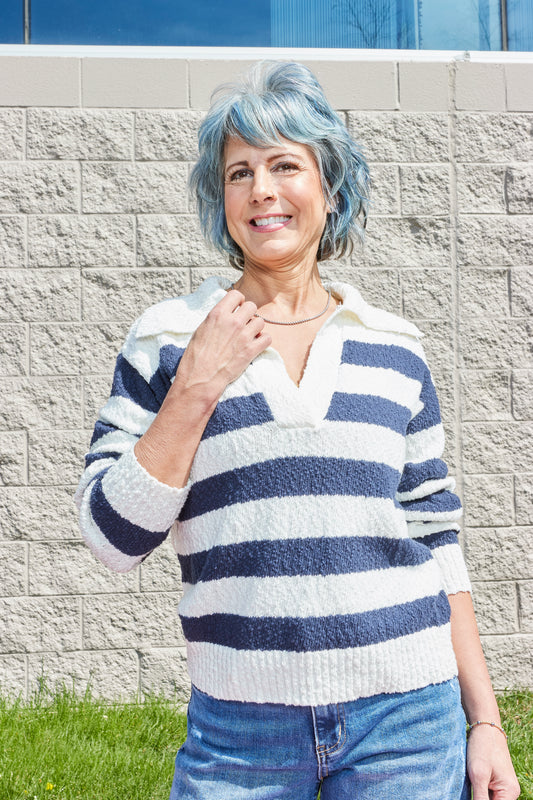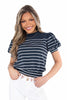 Women's Stripe Deep V-Neck Short Sleeve Knit Top- Navy