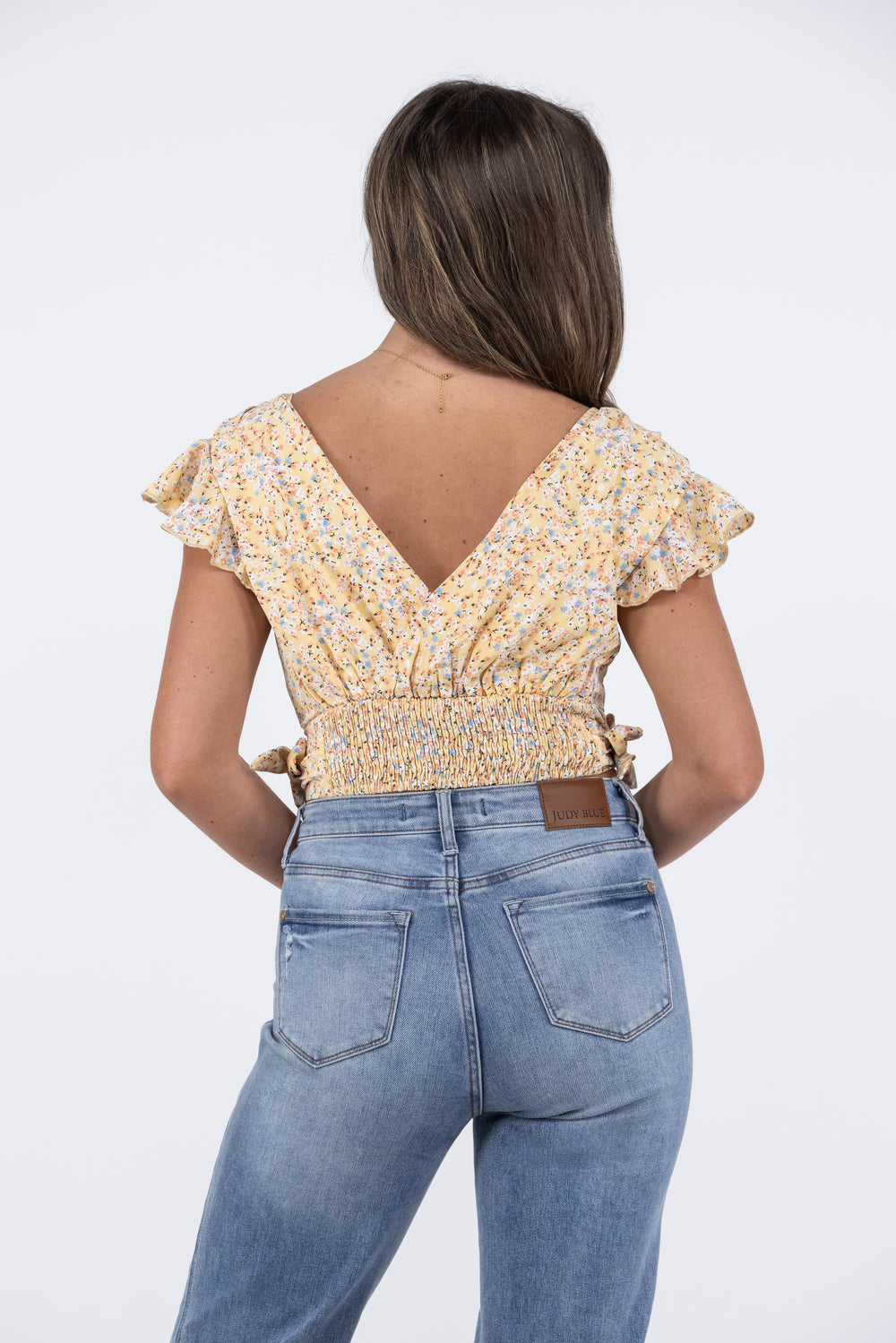 The Add To Cart Cropped Top from Heyson will make you want to click "add to cart" the second you see it! This top features a ribbed hem, decorative side ties, a crisscross v neck, and contrasting floral patterns. Pick out your favorite shoe or denim for a well rounded look!