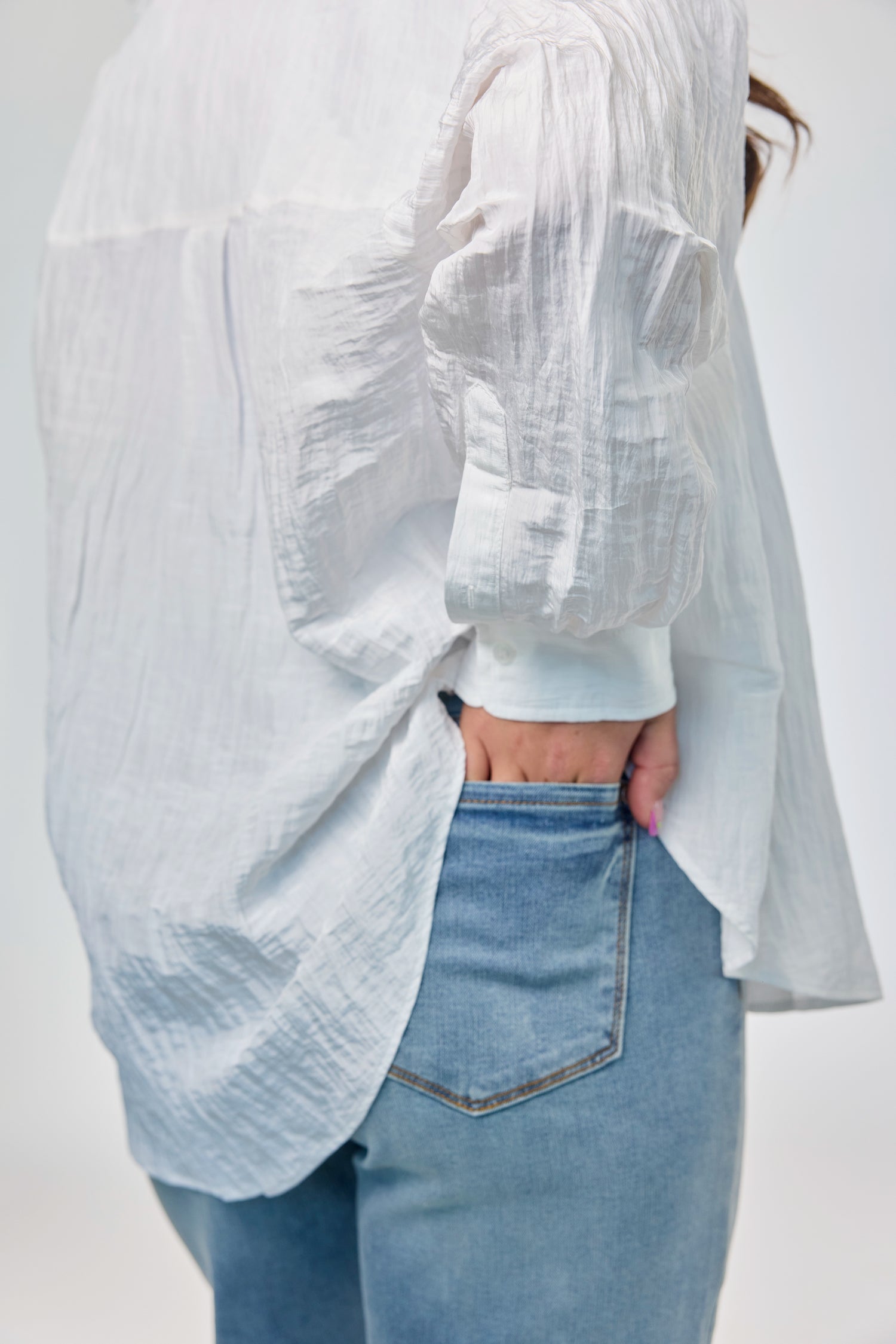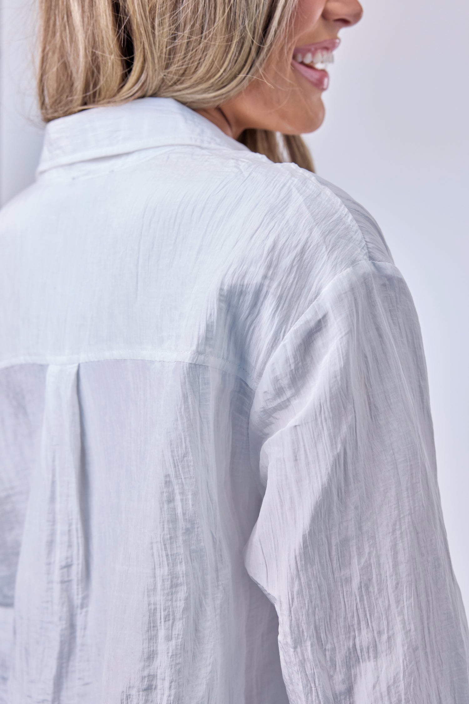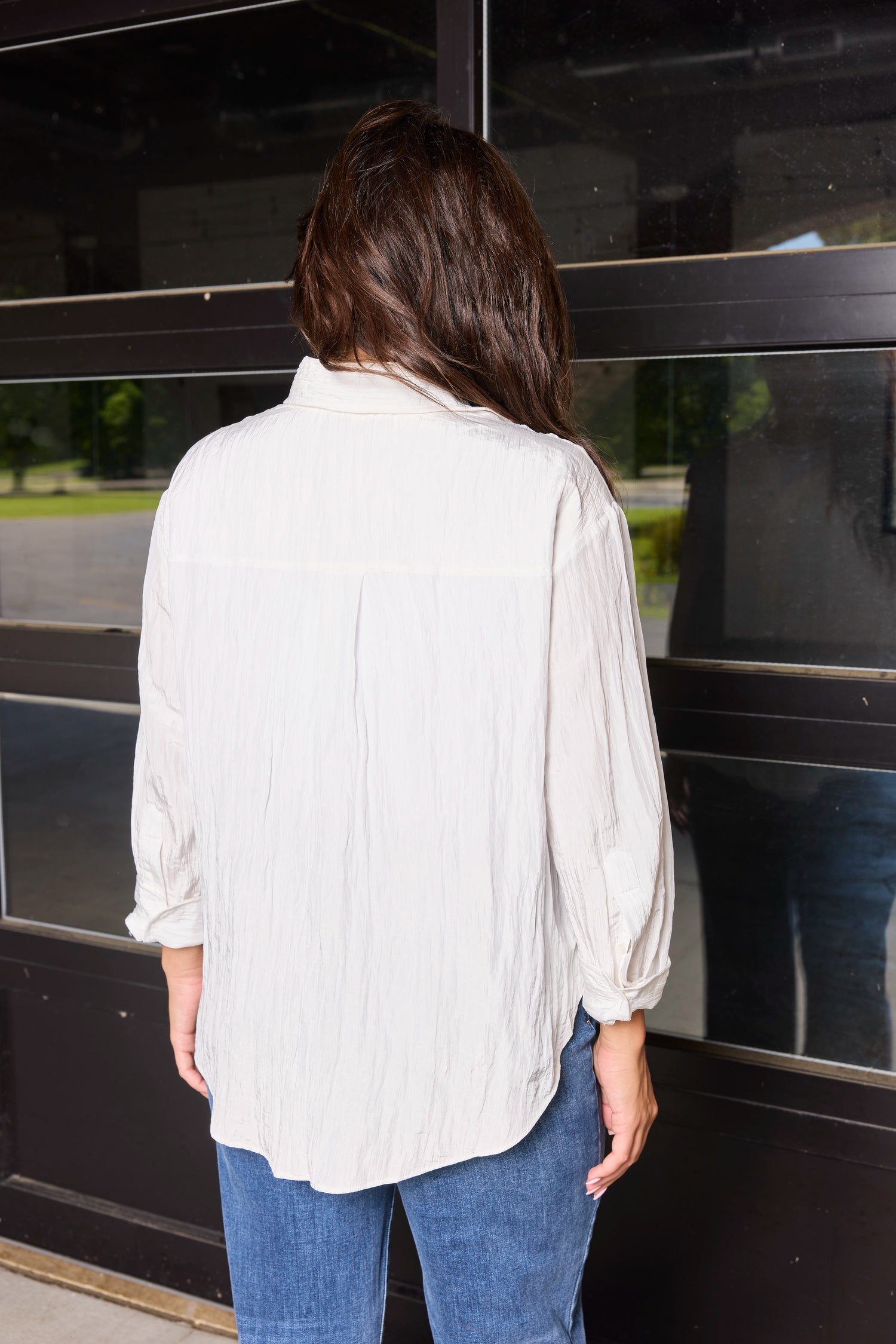 Introducing the ALB Custom Alex Long Sleeve Top - a playful twist on a classic. Featuring a collared neck, button down front closure, rounded hi-lo hem, and a unique crinkle satiny fabric. Perfect for adding a touch of fun and personality to any outfit.