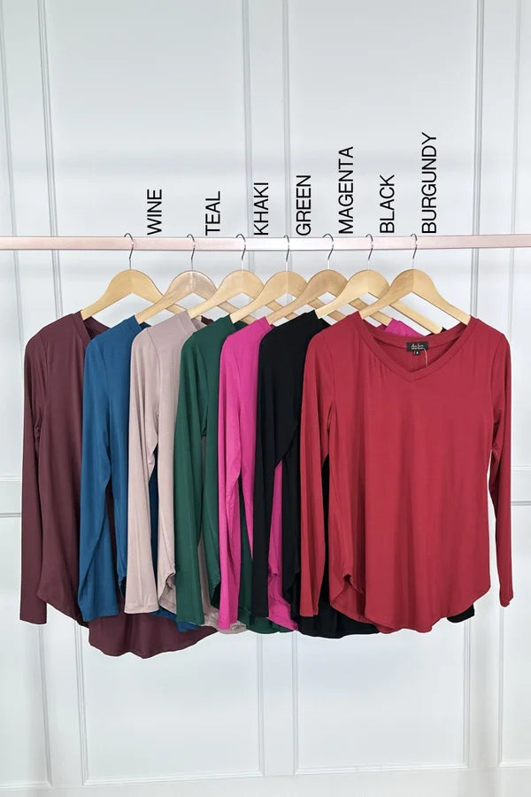 The ALB Custom All You'll Ever Need Long Sleeve Top by Ava Lane Boutique will be your new go to long sleeve top.  It features a V-neck, a rounded hemline, and the fabric is fantastic!  Perfect for layering and pairing with your favorite denim! You're going to love this top so much that you'll want one of every color!