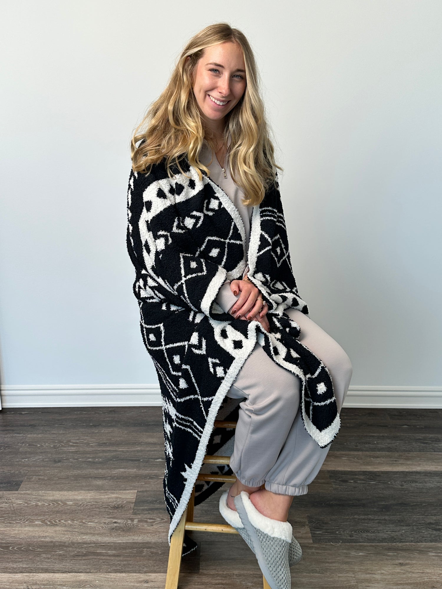 Cozy meets cool with the ALB Custom Aztec Print Blanket! In striking black and white, this 50" x 60" throw is the perfect companion for lounging on the couch or topping your queen-size bed with style. Wrap up, relax, and let the bold vibes brighten your day.
