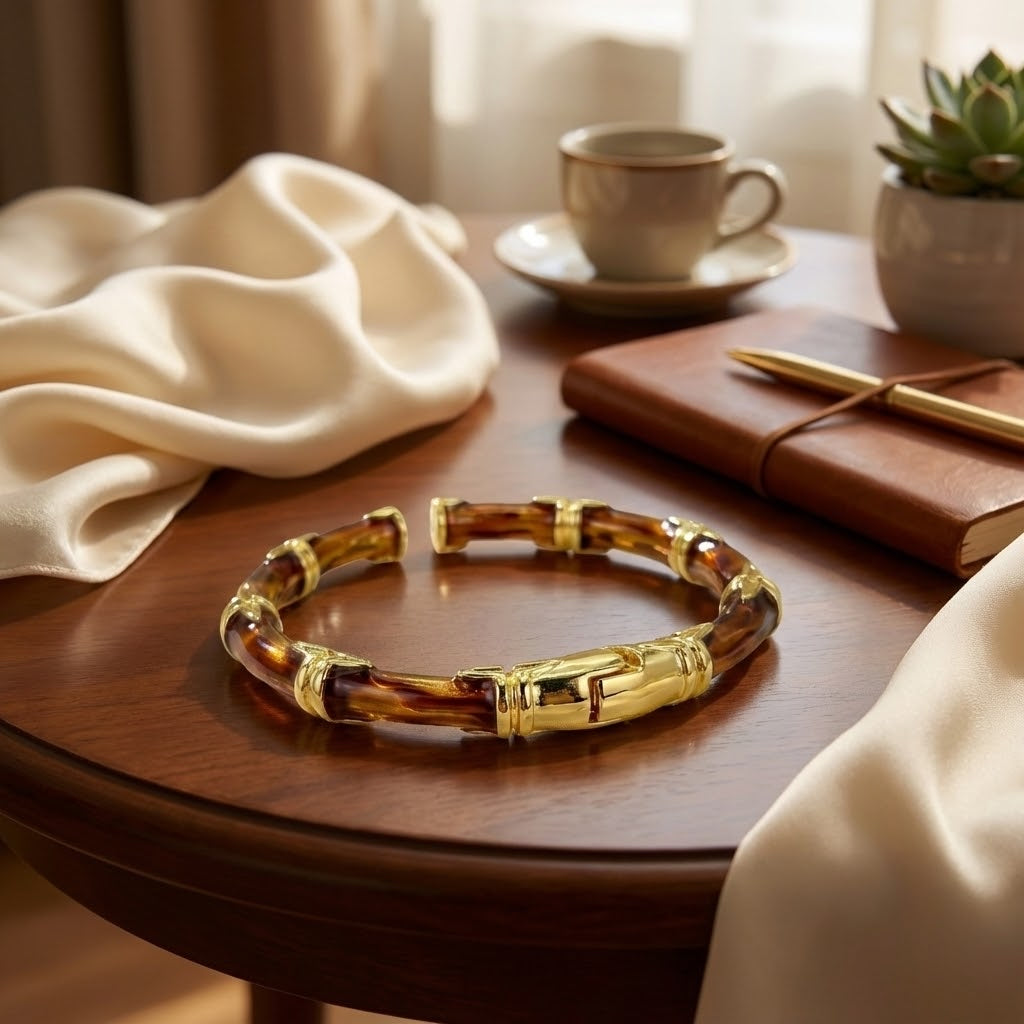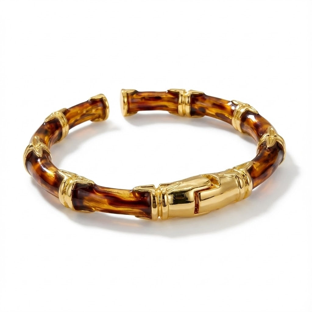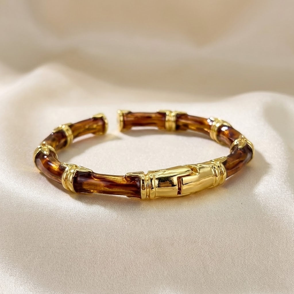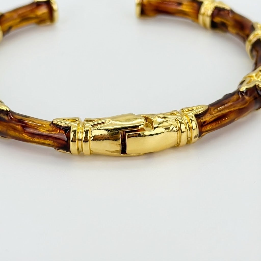 Elevate your look with the ALB Custom Bamboo-Style Hinged Bangle Bracelet. Designed with a rich, glossy “oil-drip” finish, each segment mimics the natural texture of bamboo, creating an elegant blend of organic style and modern sophistication. Gold-tone accents add a luxurious touch while ensuring durability and long-lasting shine. Its open-ended structure and hinged center, provides ease of wear and a secure fit.