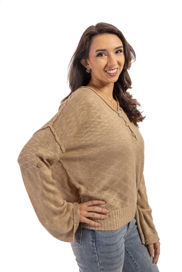 You're going to love the new ALB Custom Beautiful Tomorrow Sweater by Ava Lane Boutique. It features an open knit, rolled V-neckline with 1/4 down button closure, drop shoulder with exposed seams, ribbed cuffs, and ribbed hemline with slits on the side. On warmer days the sleeves can be rolled to 3/4 length and finished with a button tab closure. Layer over a tank and pair with denim or denim capris.