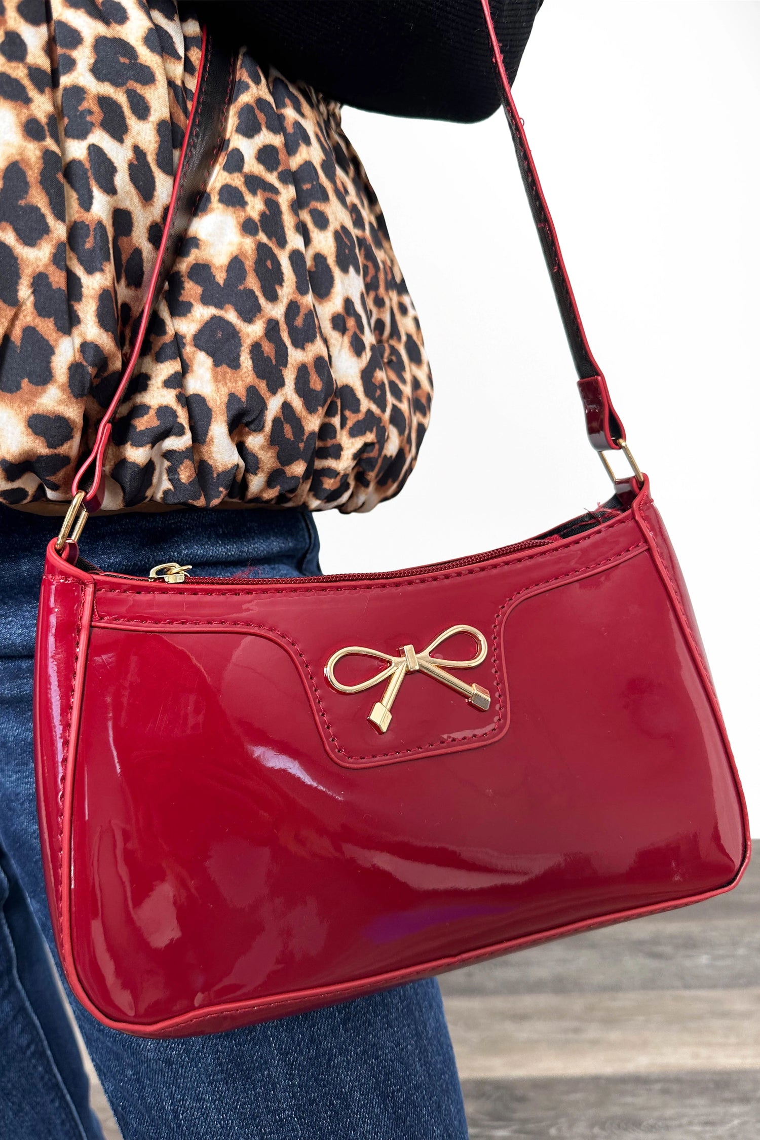 The ALB Custom Faux Patent Leather Handbag offers a sophisticated statement with its elegant gold bow accent on the front. Featuring a fixed strap for easy carrying and a secure zipper closure adorned with a refined gold charm, this purse combines timeless style with practical design, ideal for elevating any outfit with subtle luxury.