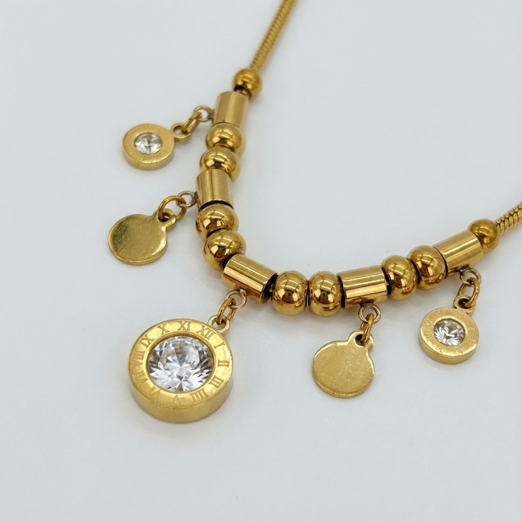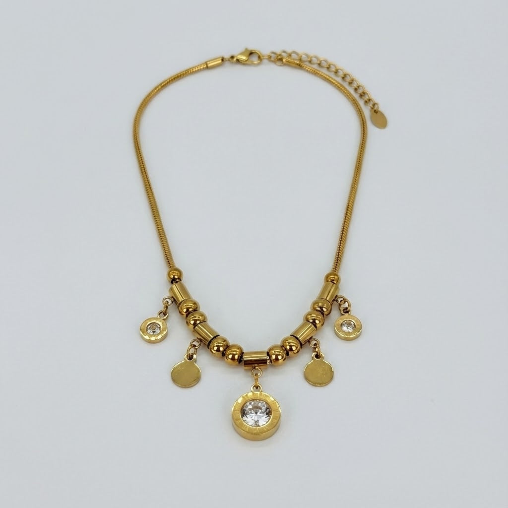 Add a playful touch of elegance to your style with this beautifully crafted gold-tone pendant necklace from Ava Lane. Made from high-quality stainless steel, the design features a series of polished beads paired with delicate dangling charms in varying sizes creating eye-catching movement and shine. One charm is accented with a sparkling zircon stone, adding a subtle hint of brilliance.