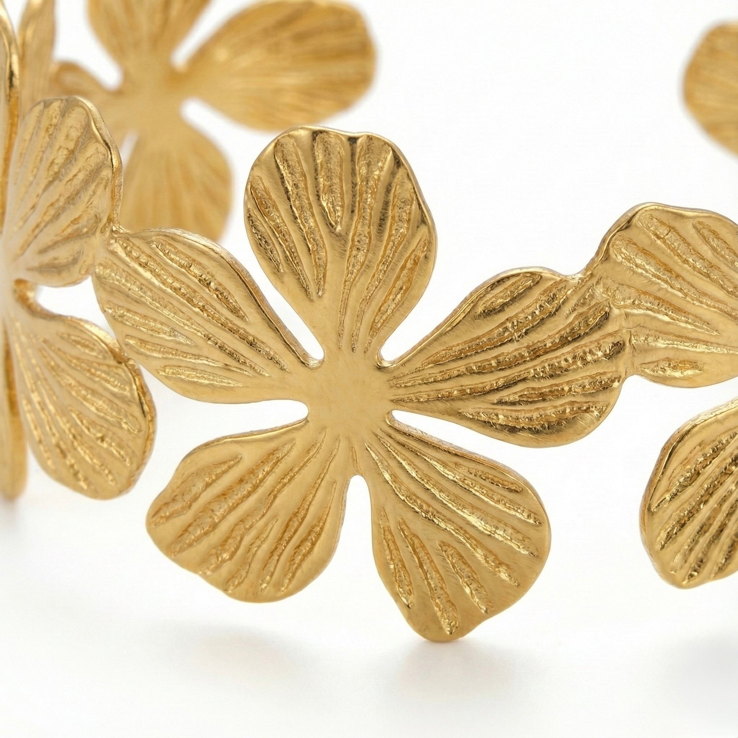 Bring a touch of natural beauty to your look with the ALB Custom Gold Floral Cuff Bracelet. Designed with detailed, textured flowers and a warm gold finish, it adds a soft, feminine accent to any outfit. The open cuff design offers easy, comfortable wear, and the 2.25 inch inner diameter fits most wrists effortlessly.
