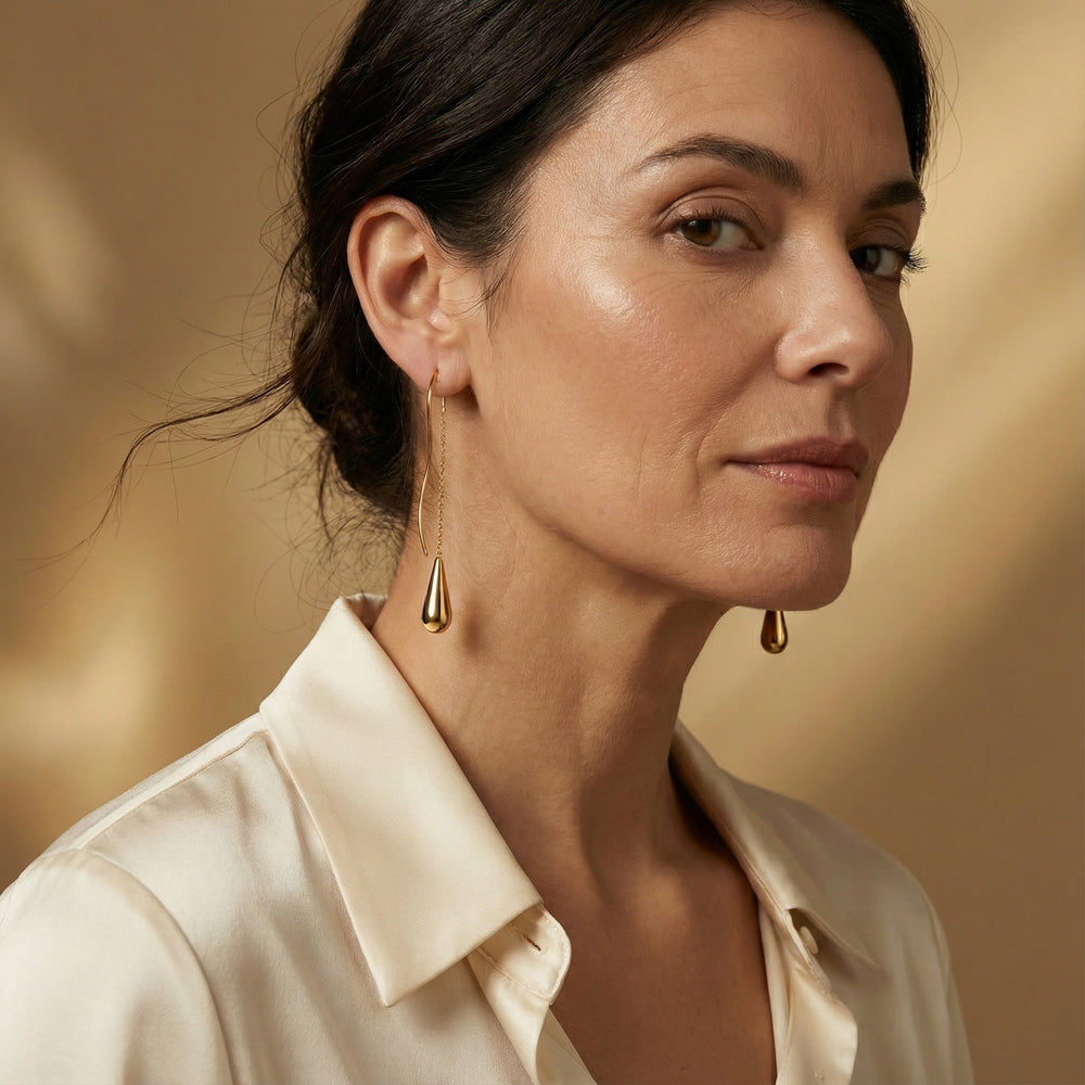 Bring sleek, modern style to your jewelry collection with these elegant gold teardrop threader earrings. Crafted from durable stainless steel, each earring features a long, delicate chain with a smooth, tapered teardrop charm. The ultra-slim chain creates a lightweight, graceful drape that moves beautifully with every step.