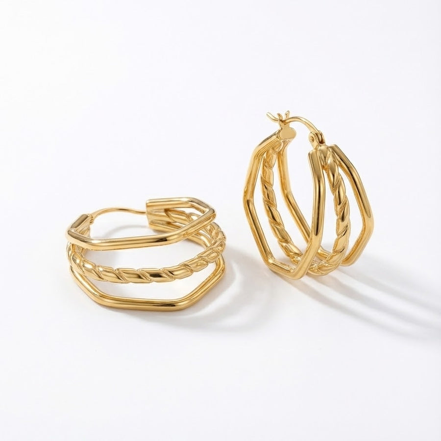 Make a bold style statement with the ALB Custom Gold Triple Hoop Earrings. Designed with a unique triple hoop structure, each earring combines smooth polished edges with a subtly textured inner hoop, creating depth and modern dimension. Crafted in 18k gold-plated stainless steel, these hoops offer a luxurious shine and a contemporary silhouette.