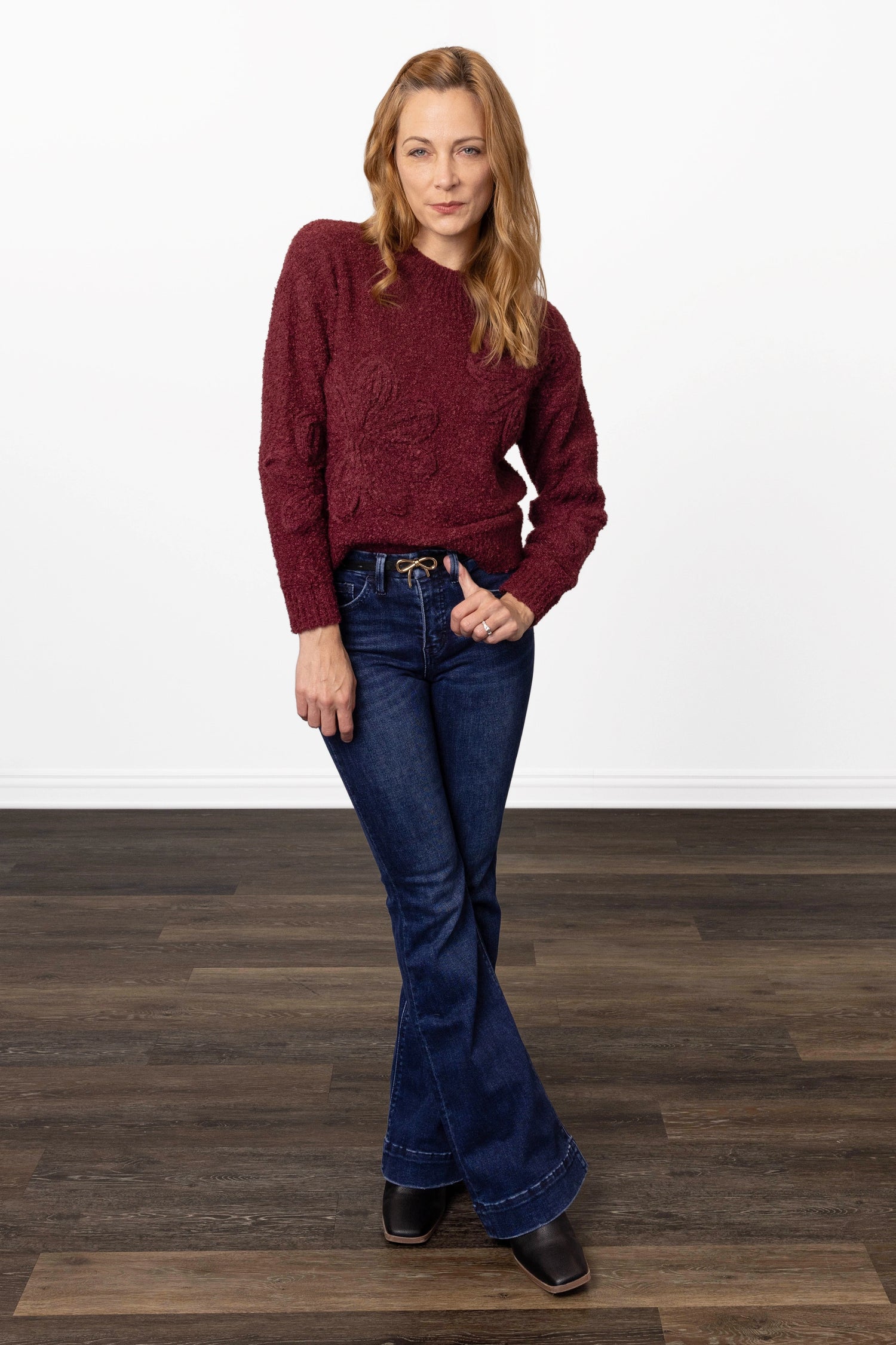 The ALB Custom Women's Ribbed Neck Floral Sweater is a cozy and stylish knit piece that combines comfort with subtle elegance. It features a super soft knit fabric for a plush, comfortable feel. Ribbed detailing at the neck, cuffs, and hem for a snug, structured fit. A monochromatic design, with a large floral embellishment crafted in the same color as the sweater, adding texture and visual interest without being overpowering. Overall, it's a refined take on a classic sweater, with understated floral accents that make it versatile for both casual and dressier occasions.