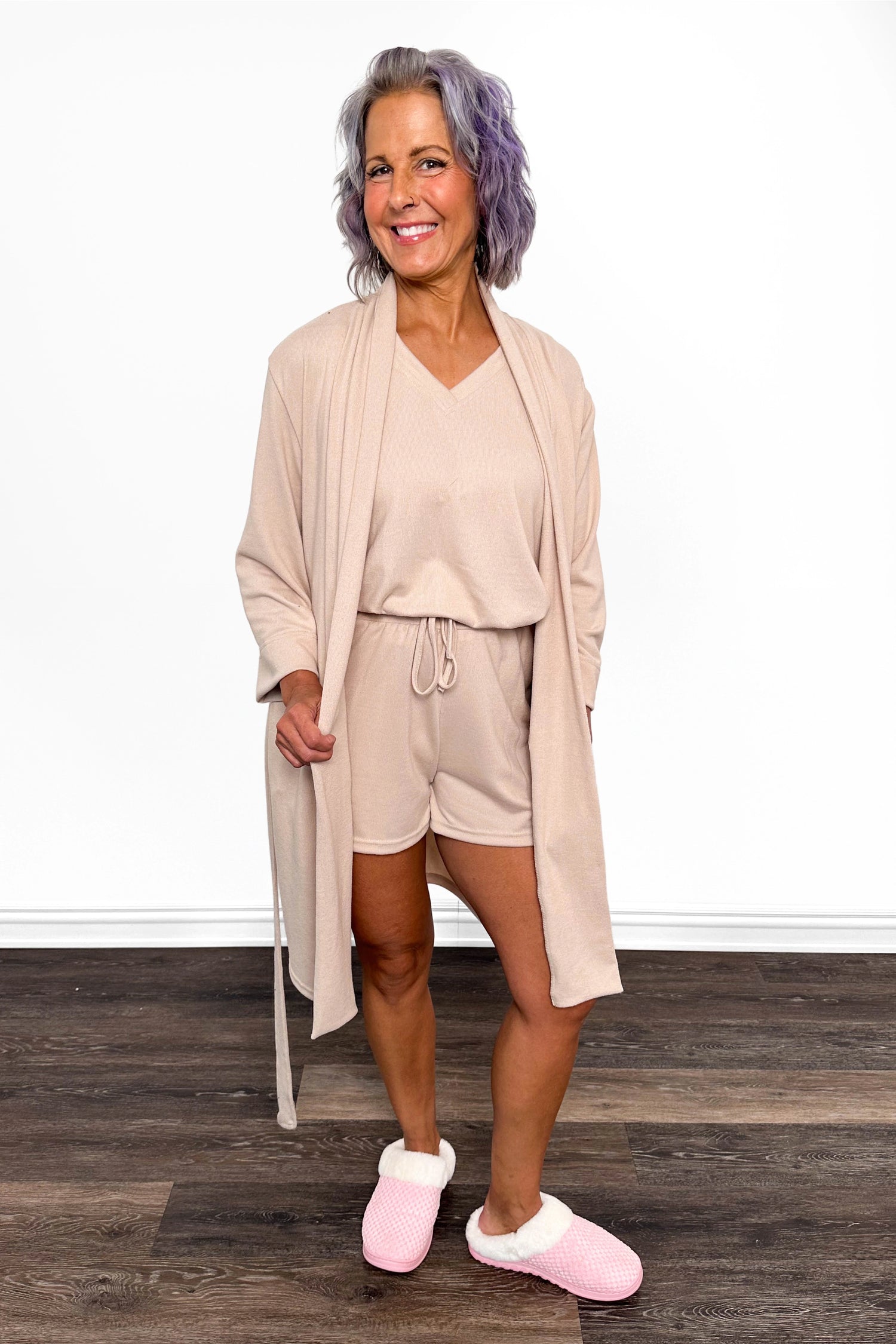 Discover comfort redefined with the ALB Custom Women's 3-Piece Lounge Set; your new go-to for relaxed, put-together days at home. This custom collection pairs a front-tie robe with a flattering V-neck tank and comfortable drawstring shorts, giving you endless styling possibilities. Each piece is designed to work independently or together, so you can create the perfect look whether you're working from home, running errands, or simply enjoying downtime. Soft, versatile, and effortlessly chic, this set transforms loungewear into an experience you'll actually want to wear.