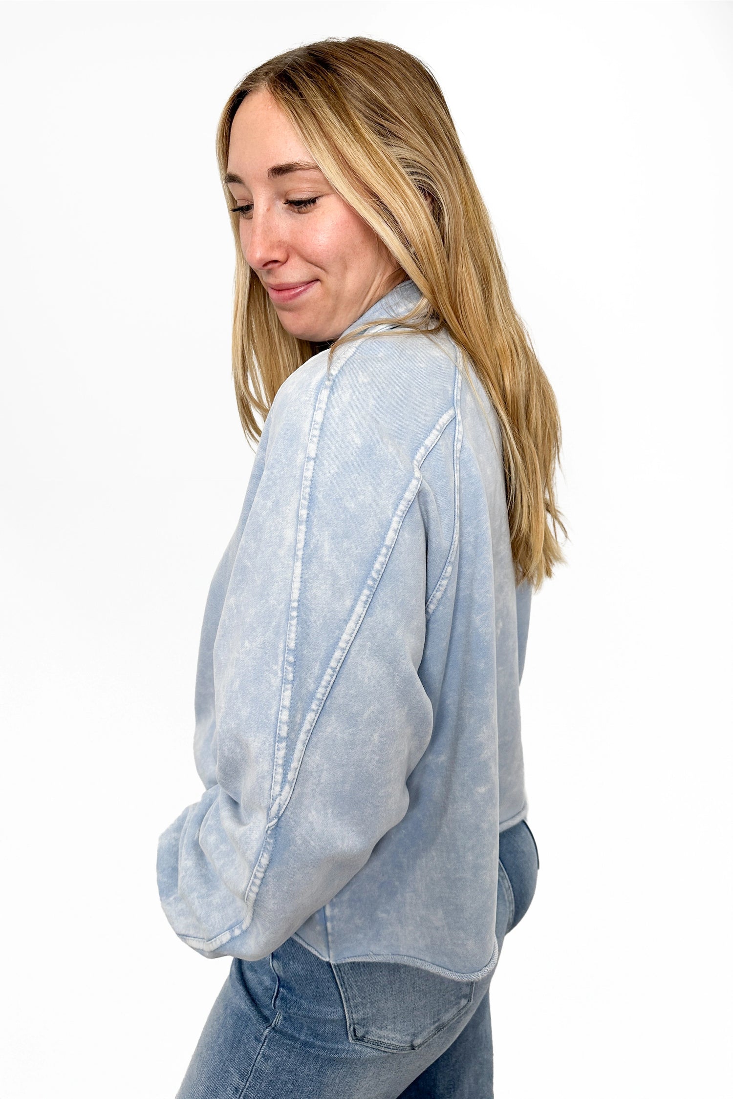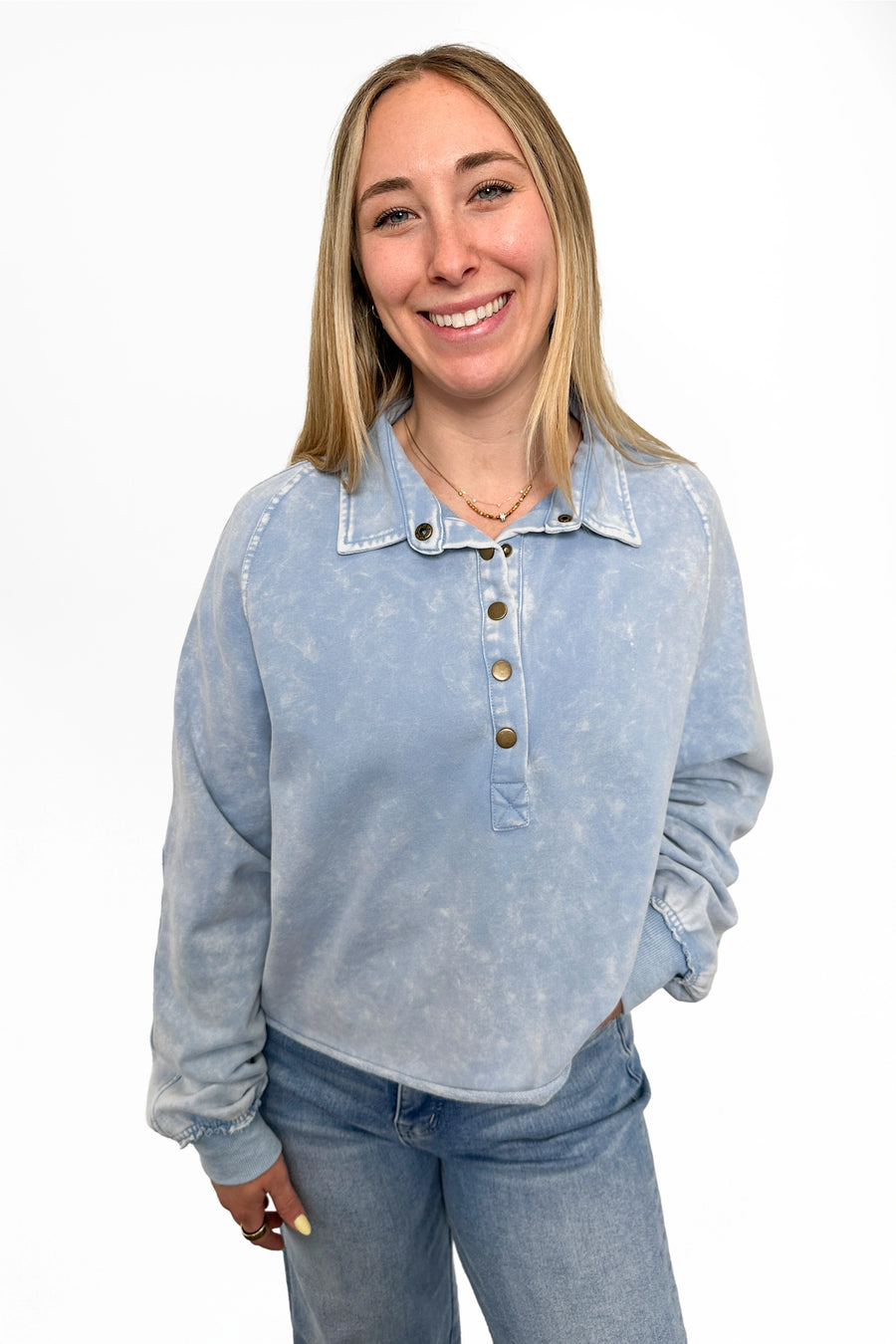 The ALB Custom Women's Button Collared Sweatshirt is the piece that refuses to blend in. Featuring a button collar you can actually use, this piece combines comfort with undeniable edge. The soft wash creates an instantly vintage feel, while functional buttons give you styling flexibility throughout the day. Ribbed cuffs provide a polished finish, and the cropped cut with raw hemline keeps things fresh and fashion-forward. It's the kind of sweatshirt that makes every outfit feel intentional.