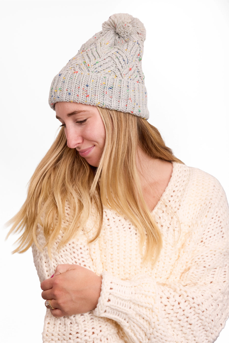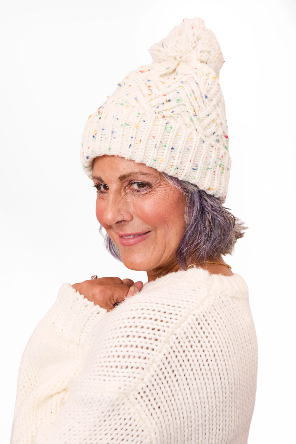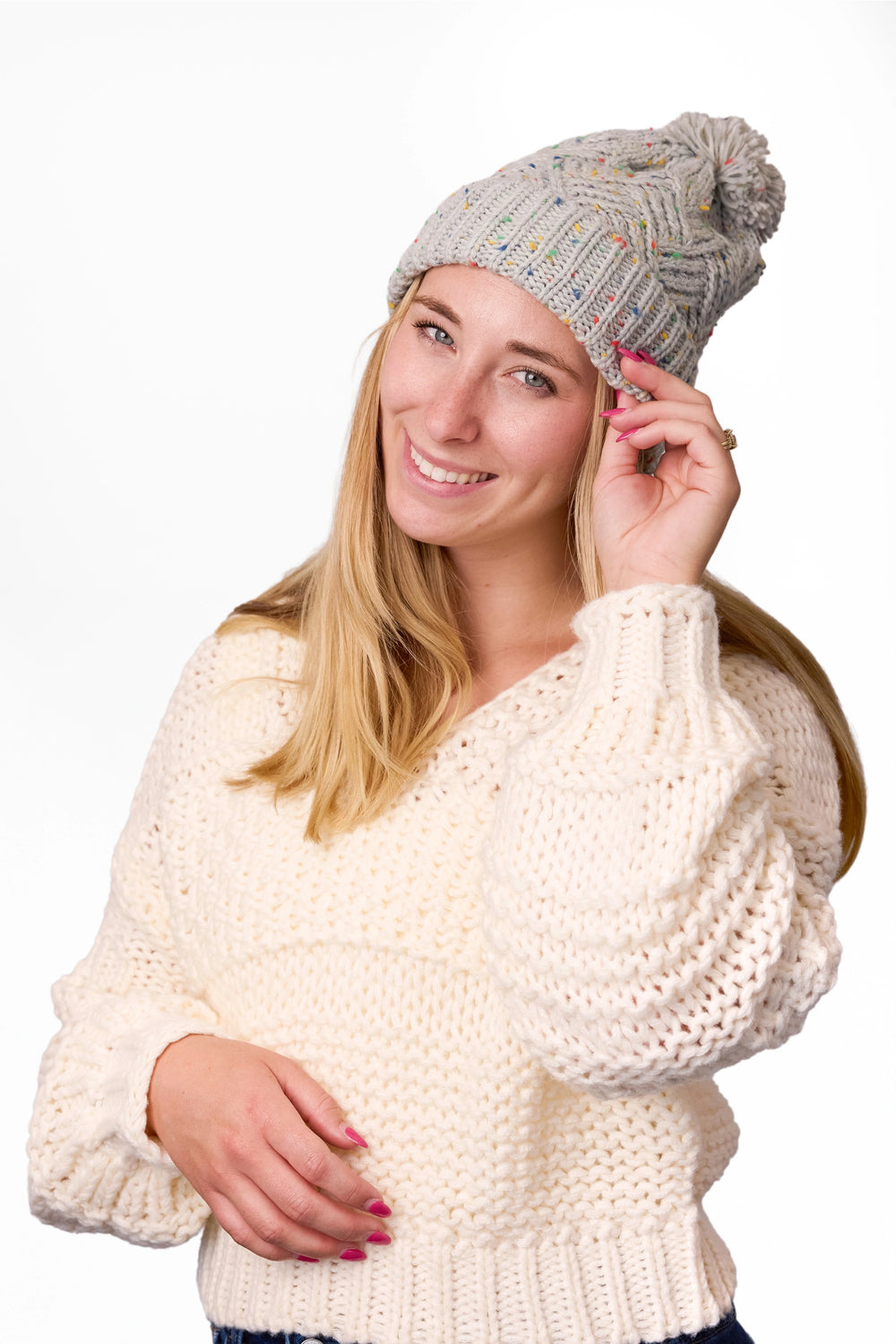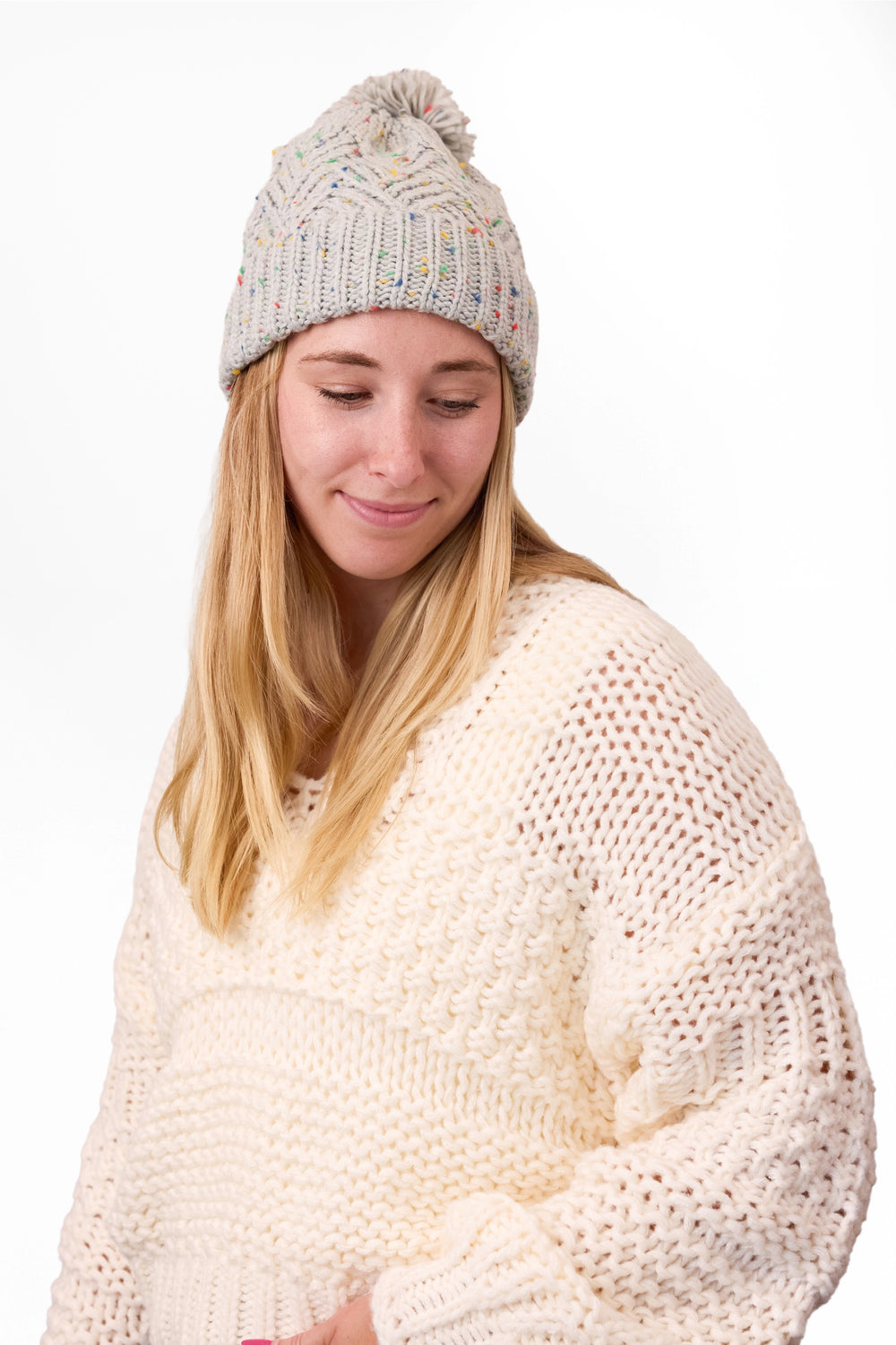 Add a burst of fun to your winter wardrobe with the ALB Custom Women's Confetti Knit Pom Beanie. Featuring a lively multicolor confetti knit and a charming permanent string pom on top, this beanie keeps you warm wherever you go. Perfect for mixing warmth with a playful pop of color.