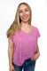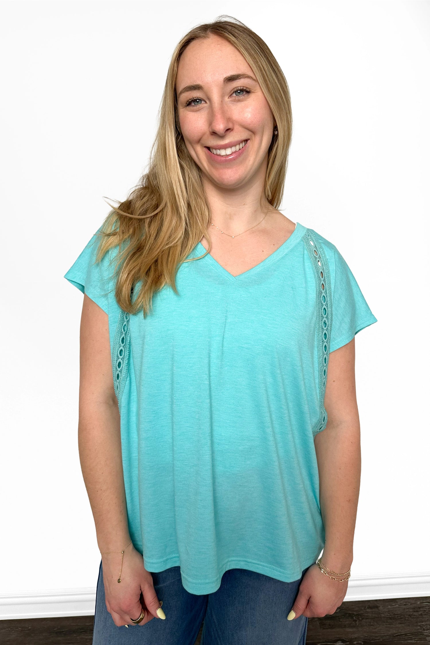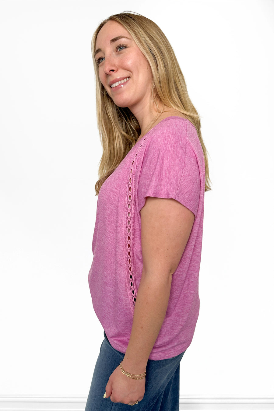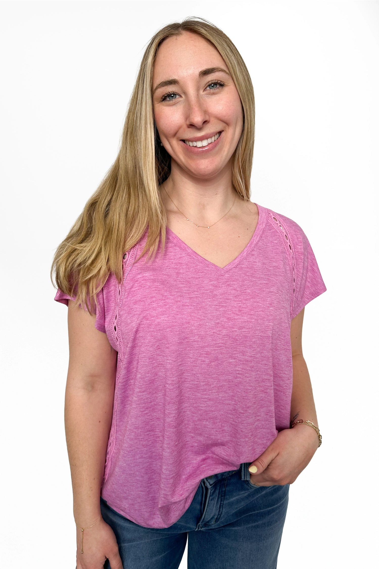 Perfectly feminine and easy to wear, the ALB Custom Women's Feminine Eyelet Trim V-Neck Top features a soft heathered knit with delicate openwork eyelet trim detailing along the shoulders for a subtle touch of texture. Designed with a flattering v-neckline and relaxed dolman style short sleeves this lightweight knit drapes beautifully for complete comfort and coverage. The breathable fabric and silhouette make it perfect for pairing with your favorite denim or layering under your favorite cardigan. Casual yet polished this top is your new wardrobe staple with a romantic twist.