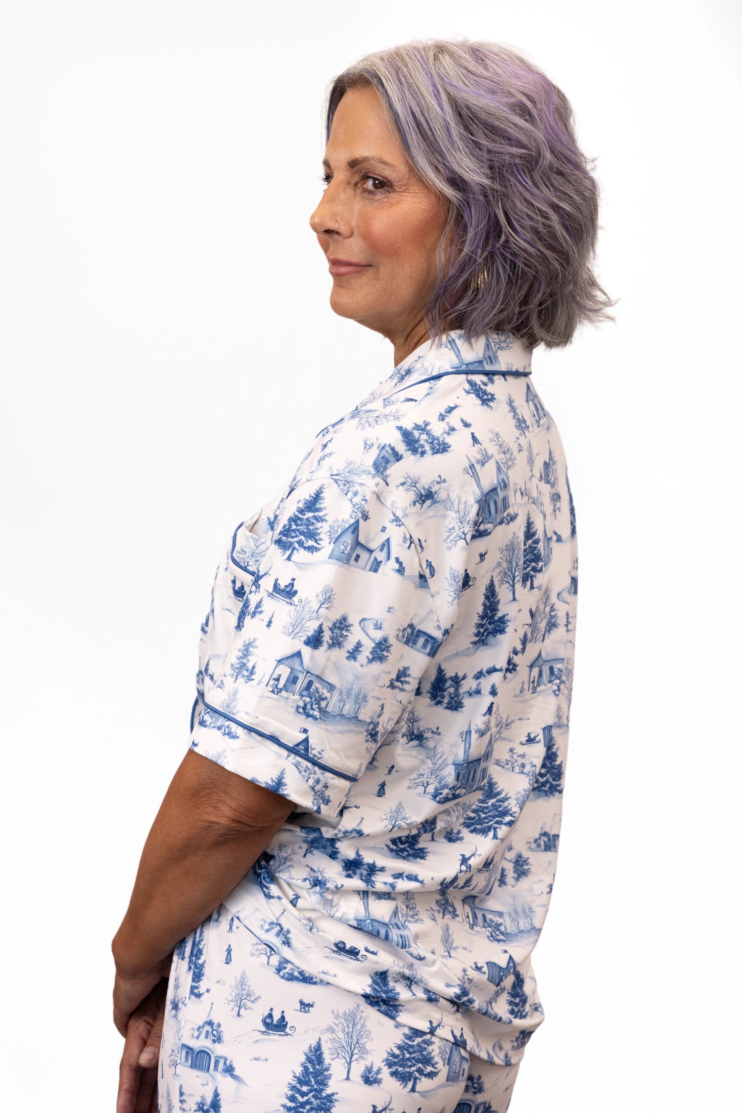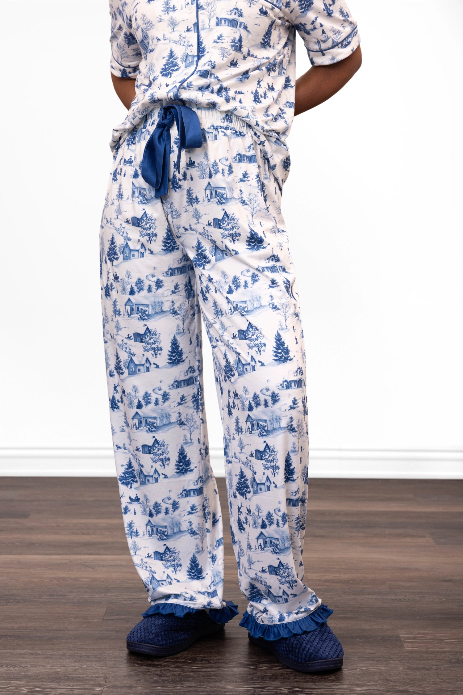 Get cozy in style with our ALB Custom Women's Festive Short Sleeve and Pants Jammies Set! Choose from three vibrant designs that bring holiday cheer to your loungewear rotation. Each set features a relaxed short sleeve button-up top paired with comfortable wide-leg pants, complete with a decorative drawstring and charming ruffle trim at the hem. Perfect for festive nights in or casual weekend wear, these jammies combine playful flair with all-day comfort.