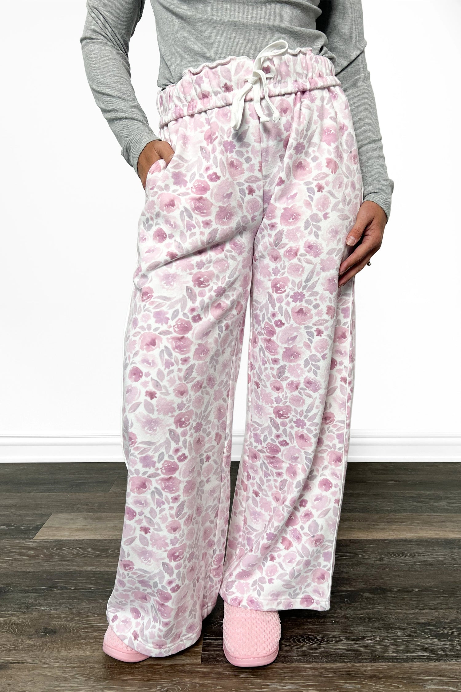 Get ready to lounge in style with these ALB Custom Women's Floral Print Wide Leg Pants. Choose your ideal length 29" or 32" and settle into pure comfort. The relaxed wide-leg fit with a drawstring on the inside of the waistband provides total comfort for your legs. A seam piping along the outer leg and pockets make these pants perfect for everything from binge watch marathons to casual hangouts. The floral watercolor print looks effortlessly feminine while feeling absolutely cozy.