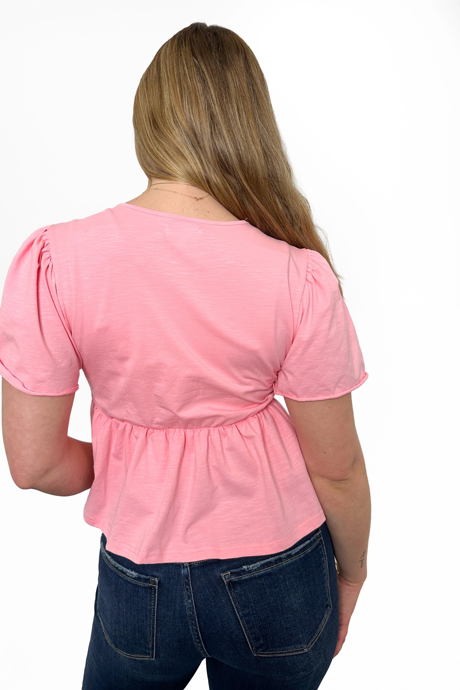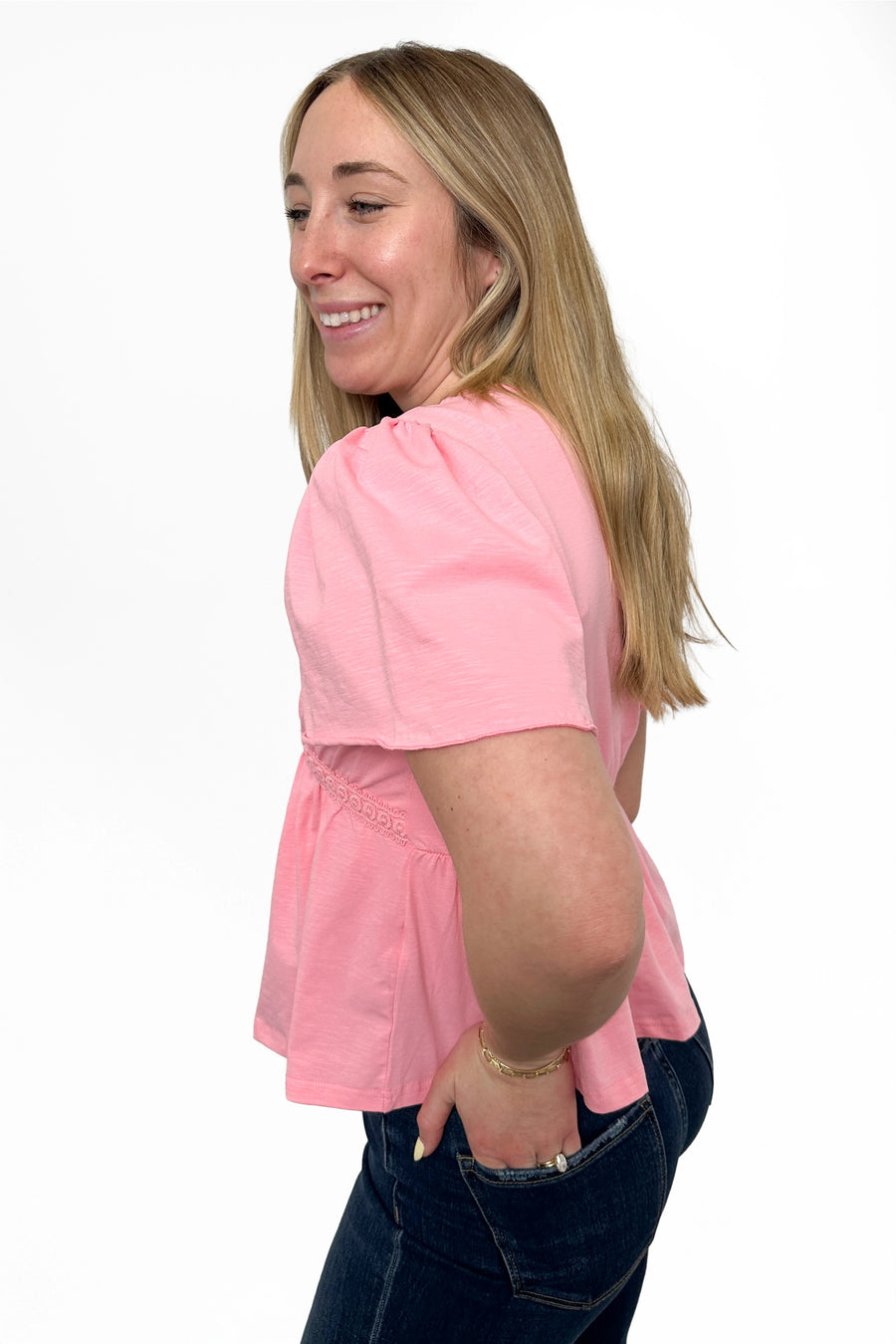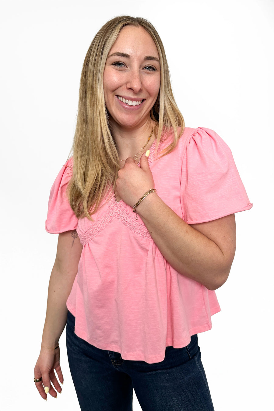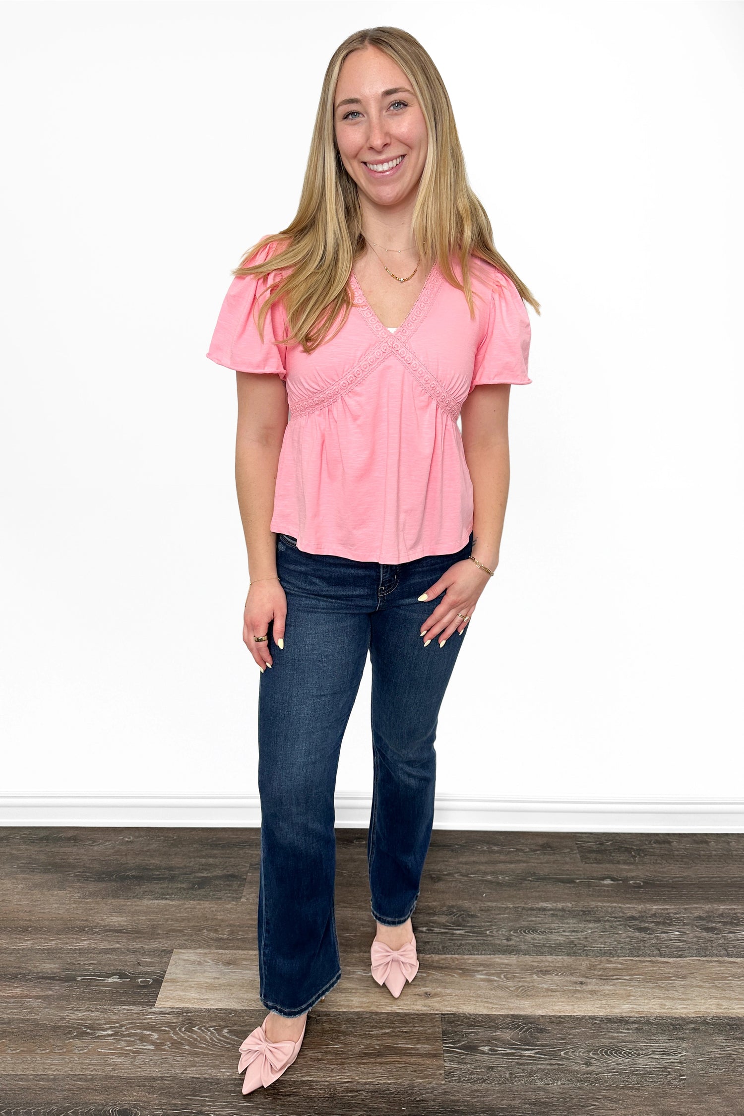 Elevate your everyday style with this Women's Lace Trim V-Neck Peplum Top by Ava Lane, designed for a flattering and feminine silhouette. Featuring soft flutter sleeves, a deep V-neckline with lace trim, and a gathered elastic waist, this lightweight top creates a flowy, figure-enhancing fit. The peplum hem adds graceful movement, making it perfect for pairing with jeans, skirts, or tailored pants. Ideal for spring and summer wear, this blouse transitions effortlessly from casual outings to dressier occasions.