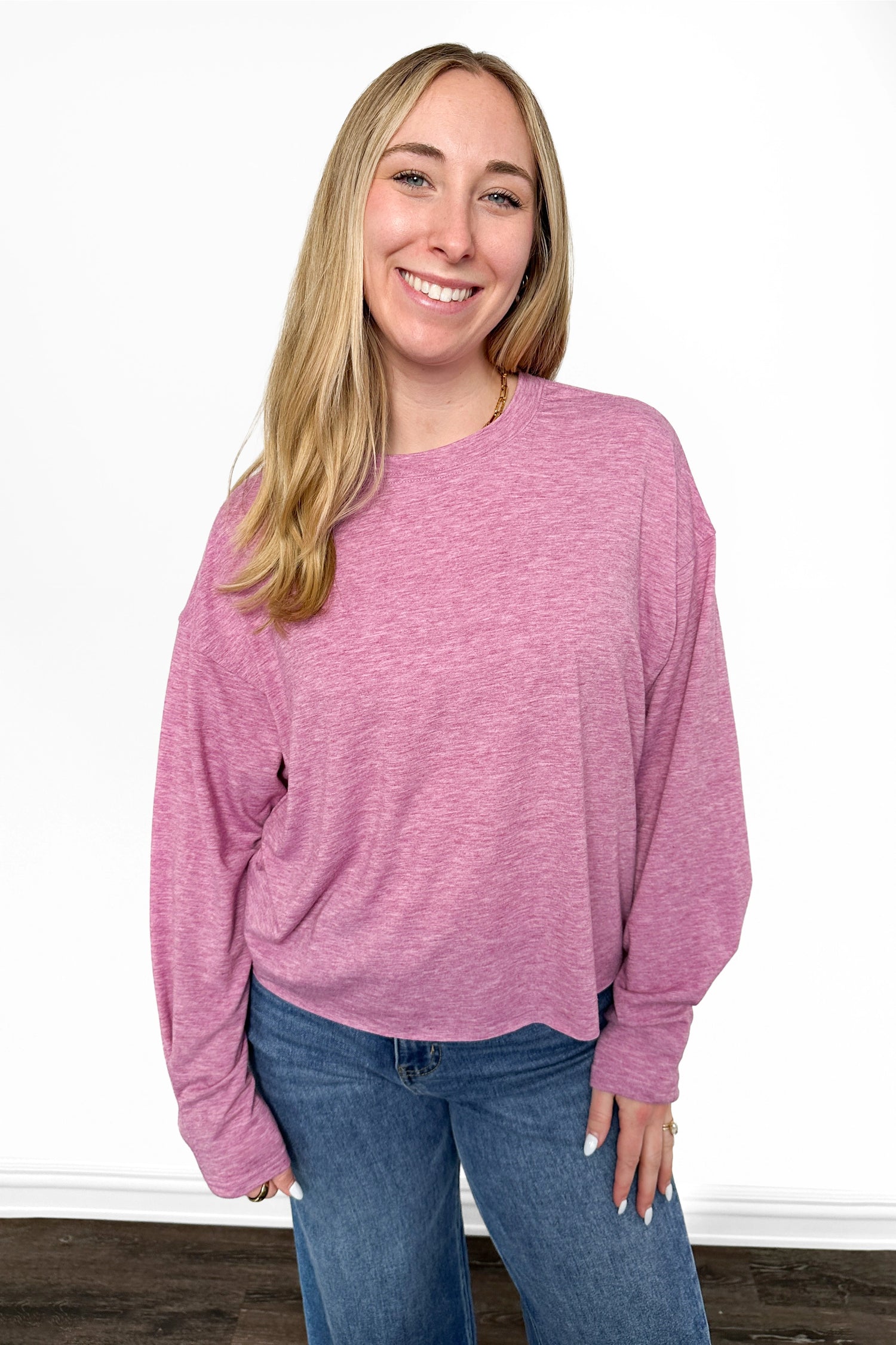Slip into effortless comfort with our ALB Custom Women's Oversized Round Neck Long Sleeve Top; the ultimate wardrobe staple that doesn't compromise on style. Designed with a relaxed, flowy silhouette and slightly cropped length, this top is your go-to for lazy days at home or quick errands around town. Choose from our range of gorgeous heathered colors to express your vibe and match whatever mood strikes.