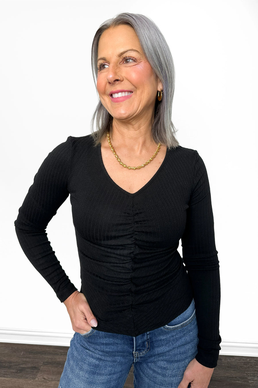With the ALB Custom Women's Pointelle Ruched V-Neck Top you'll have a wardrobe staple that works as hard as you do. Featuring a ribbed knit base enhanced by delicate pointelle detailing, this top offers understated sophistication with every wear. The expertly placed ruching at the front creates a flattering, sculpted fit that feels as good as it looks. Perfect for layering under your favorite blazer or jacket, this long sleeve top is the polished foundation piece that elevates any ensemble from ordinary to exceptional. Invest in quality that adapts to your lifestyle.