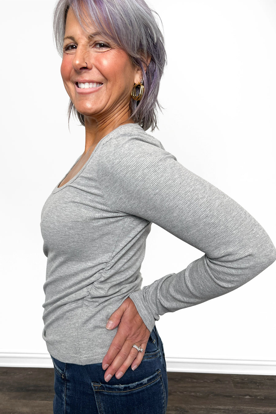 This ALB Custom Women's Scoop Neck Cinched Top is where comfort meets confidence. Thoughtfully designed from a soft, stretchy ribbed knit, it features a flattering scoop neckline and cinched sides that gently contour your shape for a fitted, feminine fit.