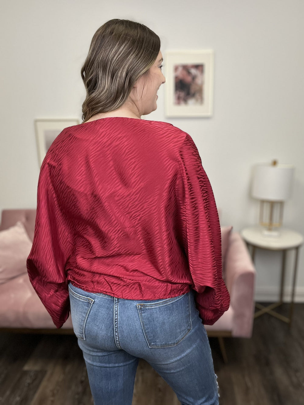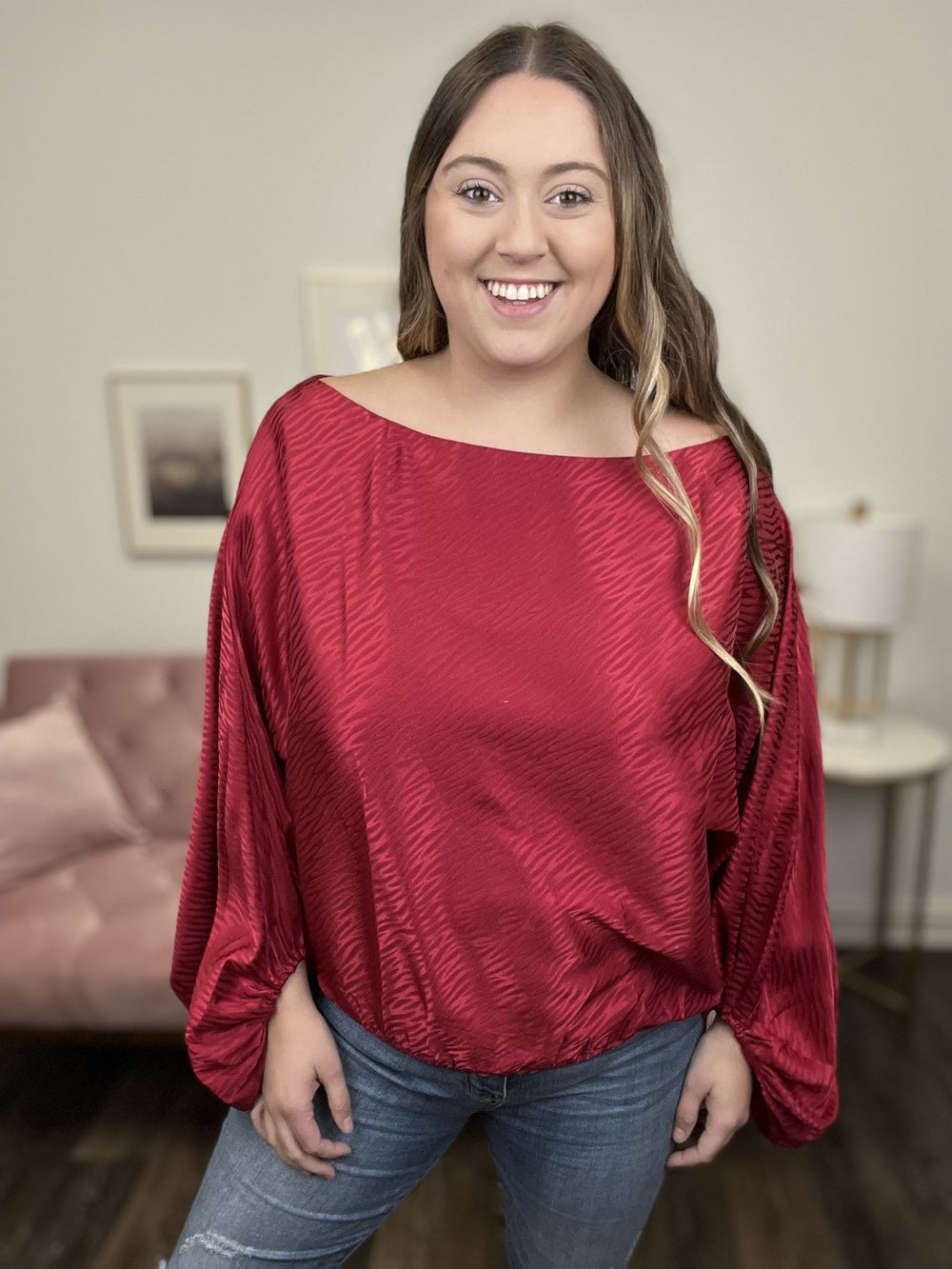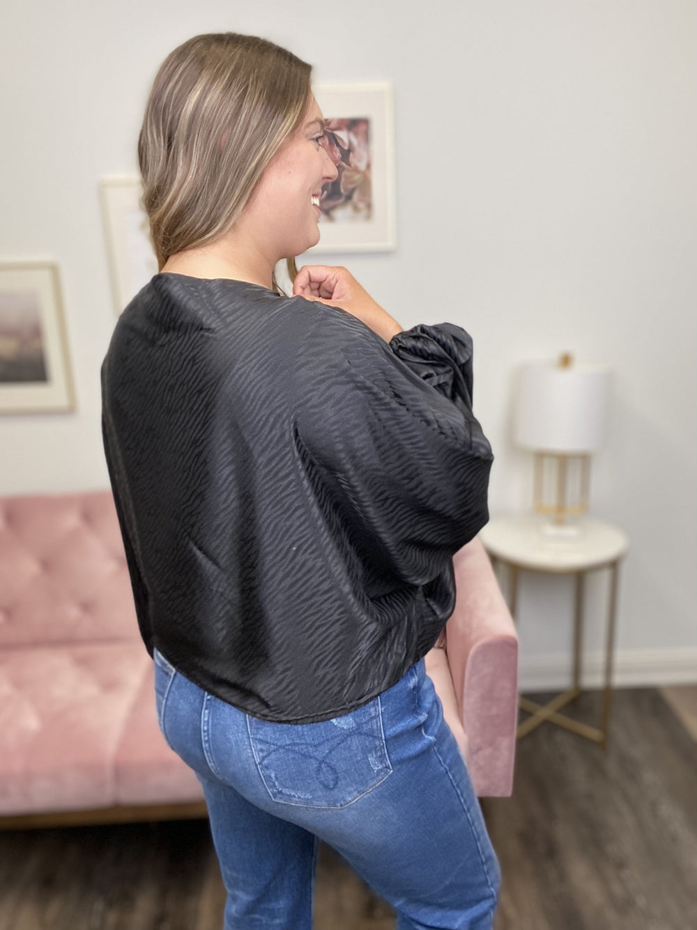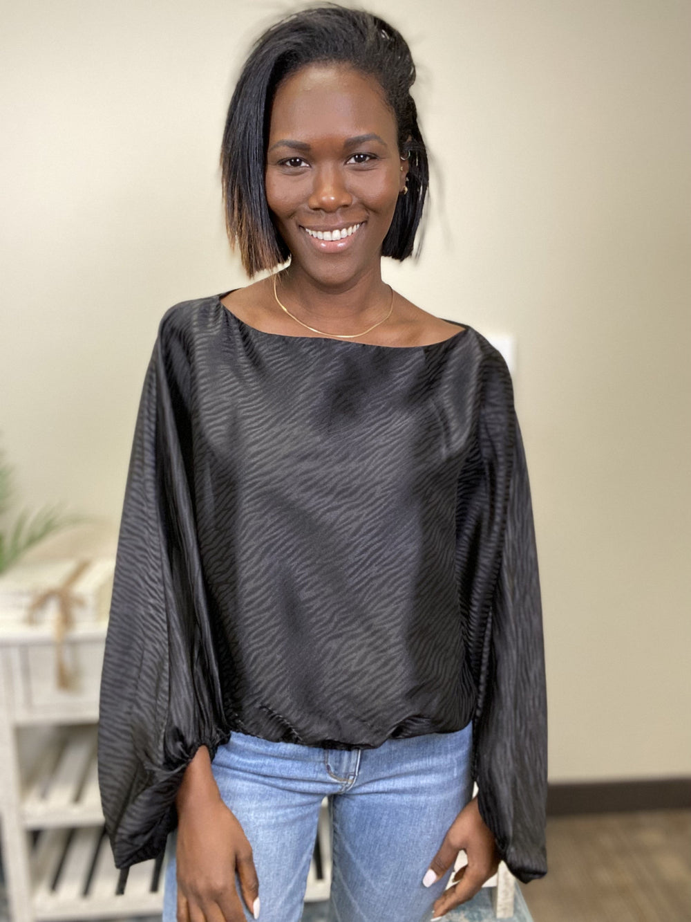 The All Ashore Top by 143 Story is a a beautiful satin zebra print blouse featuring a playable boat neckline, dolman style long balloon sleeves and an elastic waistband. Pair with your favorite denim or skirt for a little extra flirty outfit! The All Ashore Top is perfect for any occasion to dress up or down!