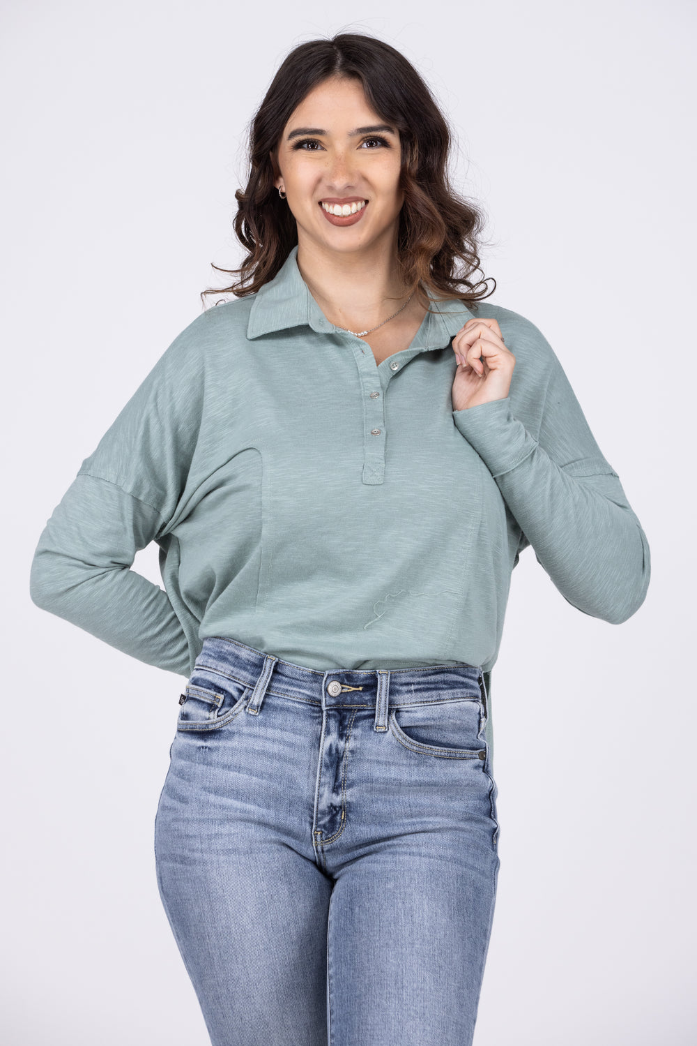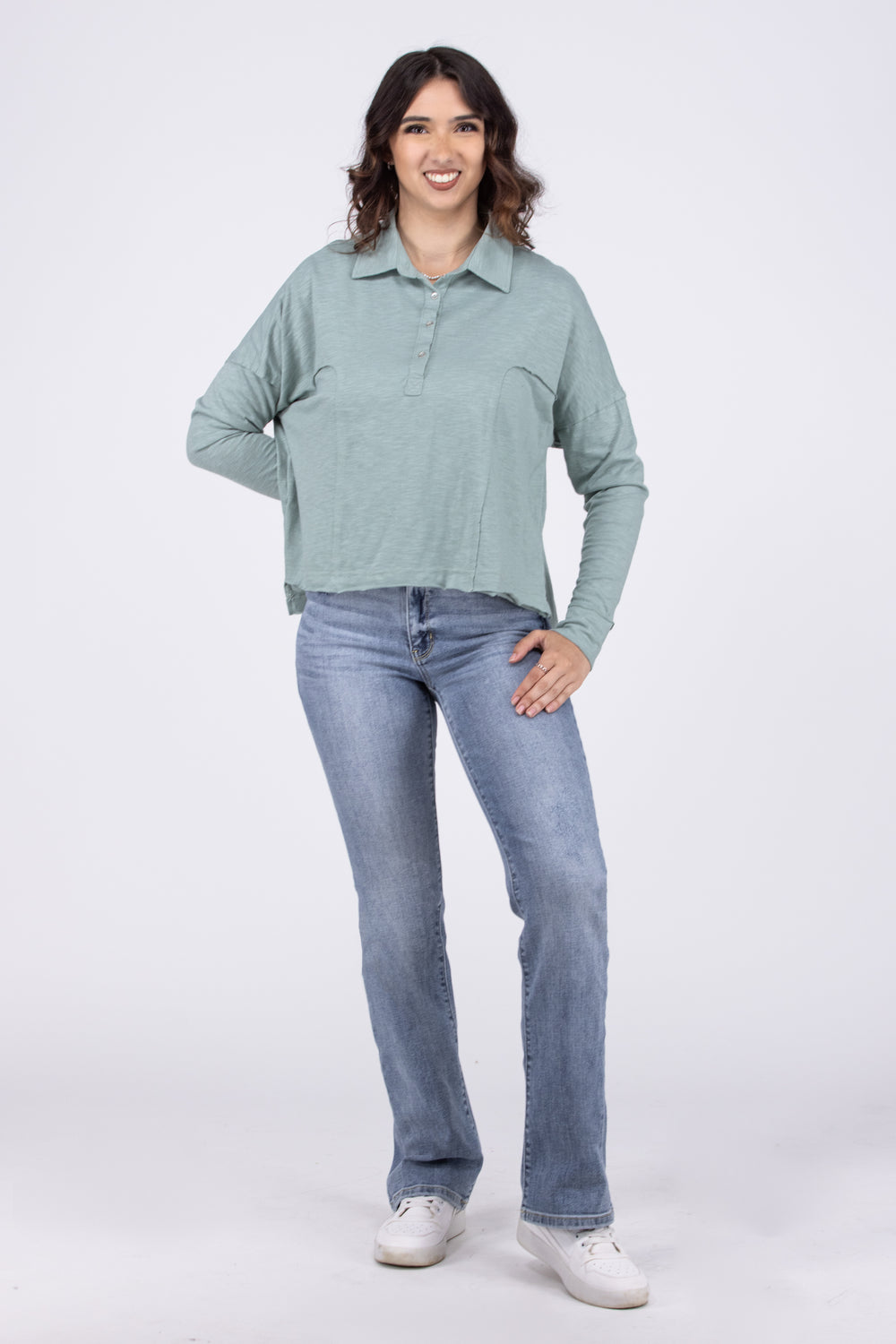 The All I Have To Give Top by In Loom is the perfect elevated basic for all seasons! This garment washed long sleeve polo tee features a collared neckline, 3/4 button front, side slits, raw hems and drop sleeves. It offers a slightly oversized fit with a slight crop style!