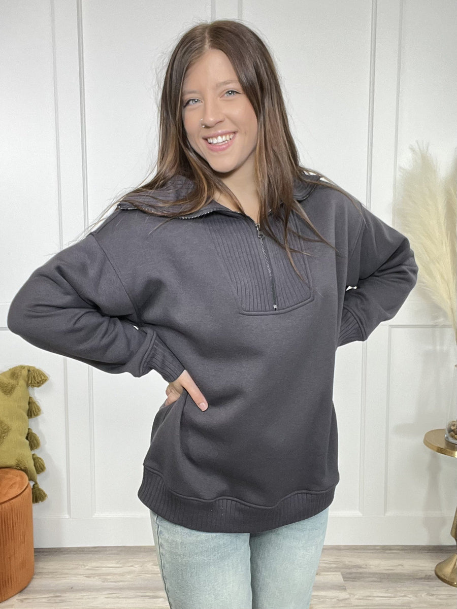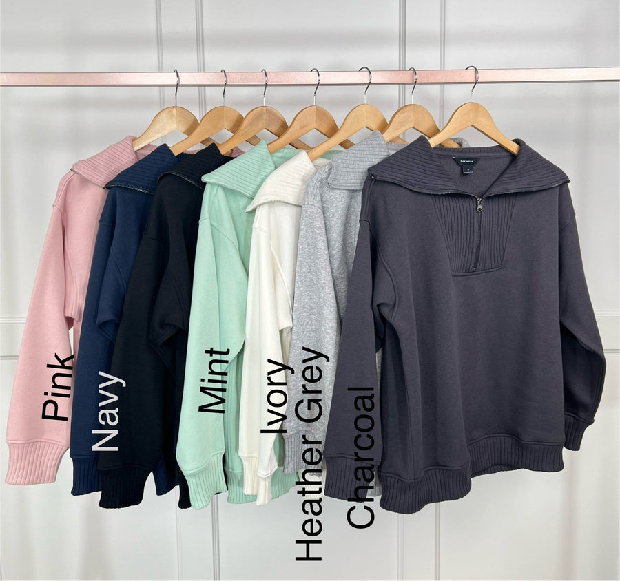 While in the Alone Time Sweatshirt from Rae Mode, you will be comfortable in any activity during your day. This sweatshirt features ribbed cuffs, hem and mock neck with a 1/4 zip. Pair with your favorite bottoms for a relaxing day or denim for a casual day out of the house.