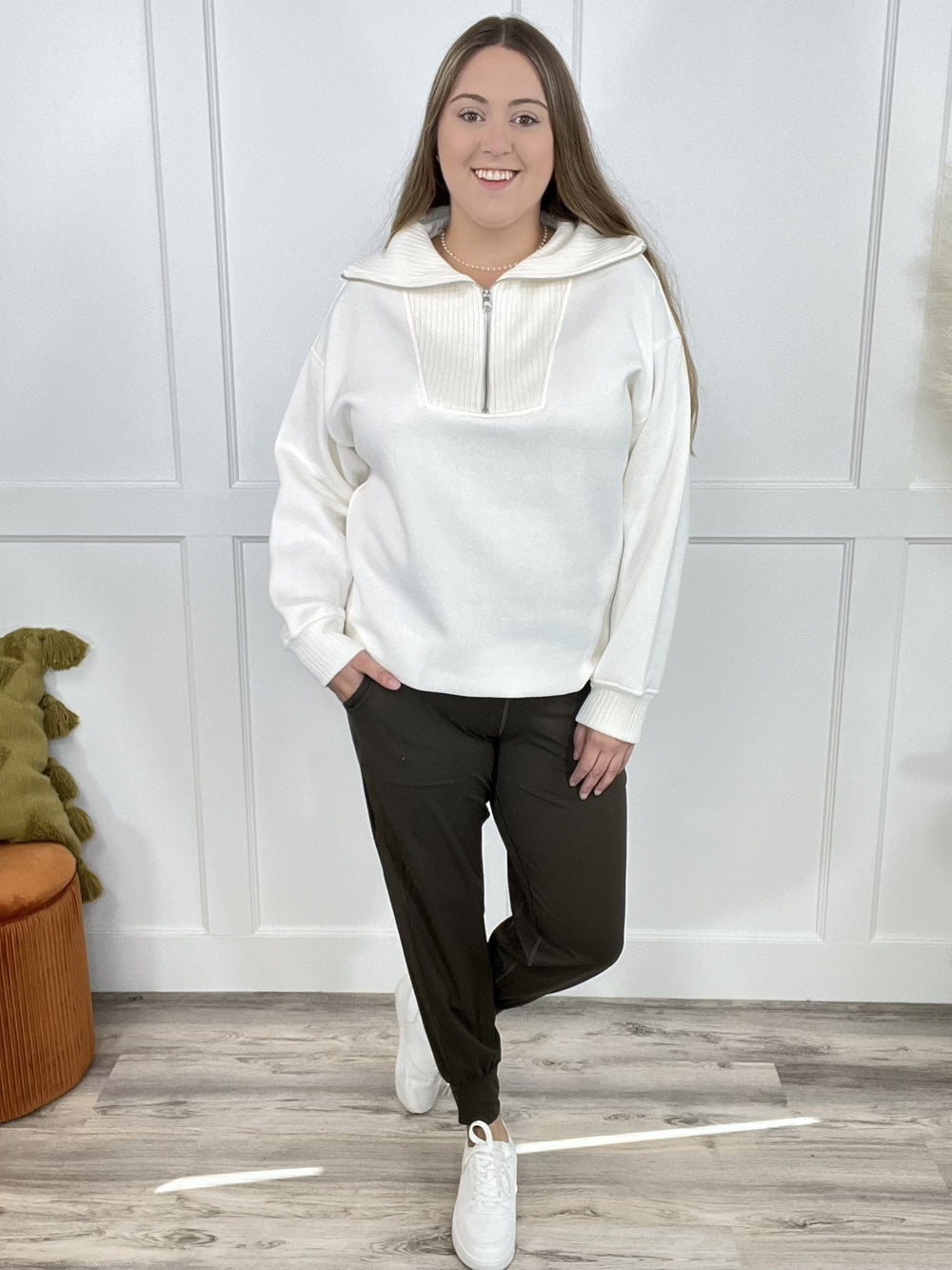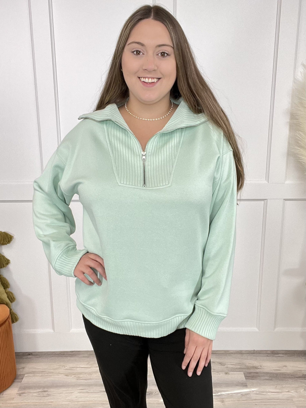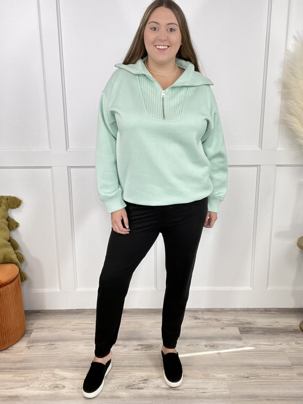 While in the Alone Time Sweatshirt from Rae Mode, you will be comfortable in any activity during your day. This sweatshirt features ribbed cuffs, hem and mock neck with a 1/4 zip. Pair with your favorite bottoms for a relaxing day or denim for a casual day out of the house.