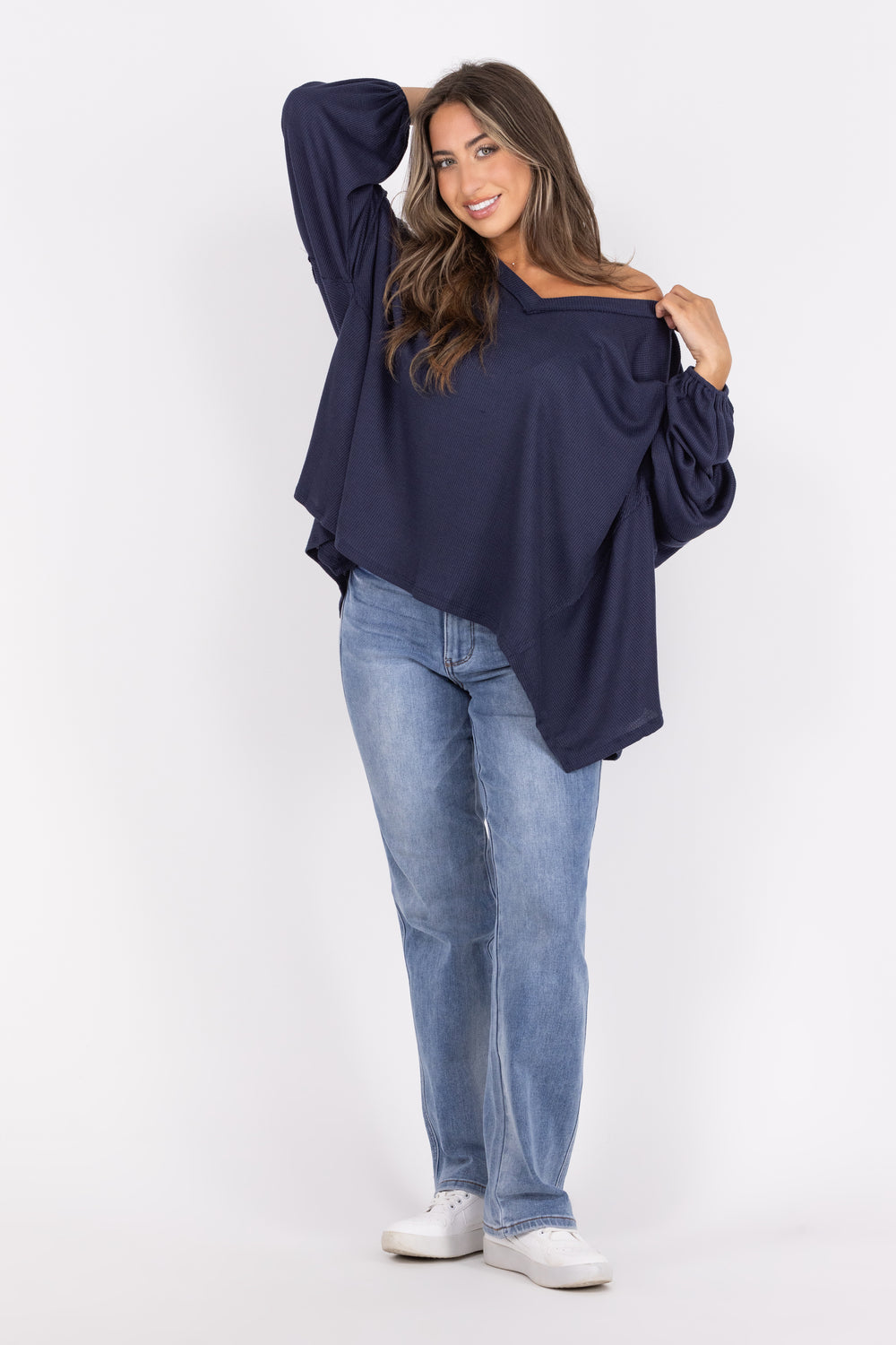 We absolutely love a good poncho style top! The Along For The Ride Top from Andree by Unit is a knit poncho top featuring an oversized bodice with v neckline and asymmetrical hemline. The long balloon sleeves are stylish and sophisticated. This stretchy, non-sheer knit top will pair perfectly with your favorite denim and booties to complete the look.