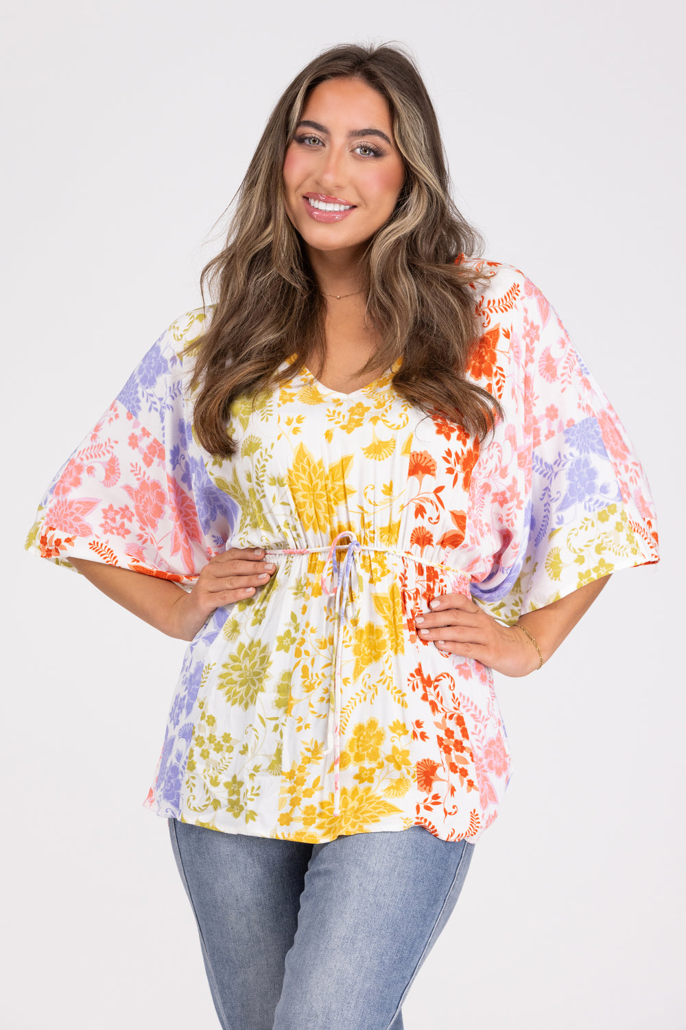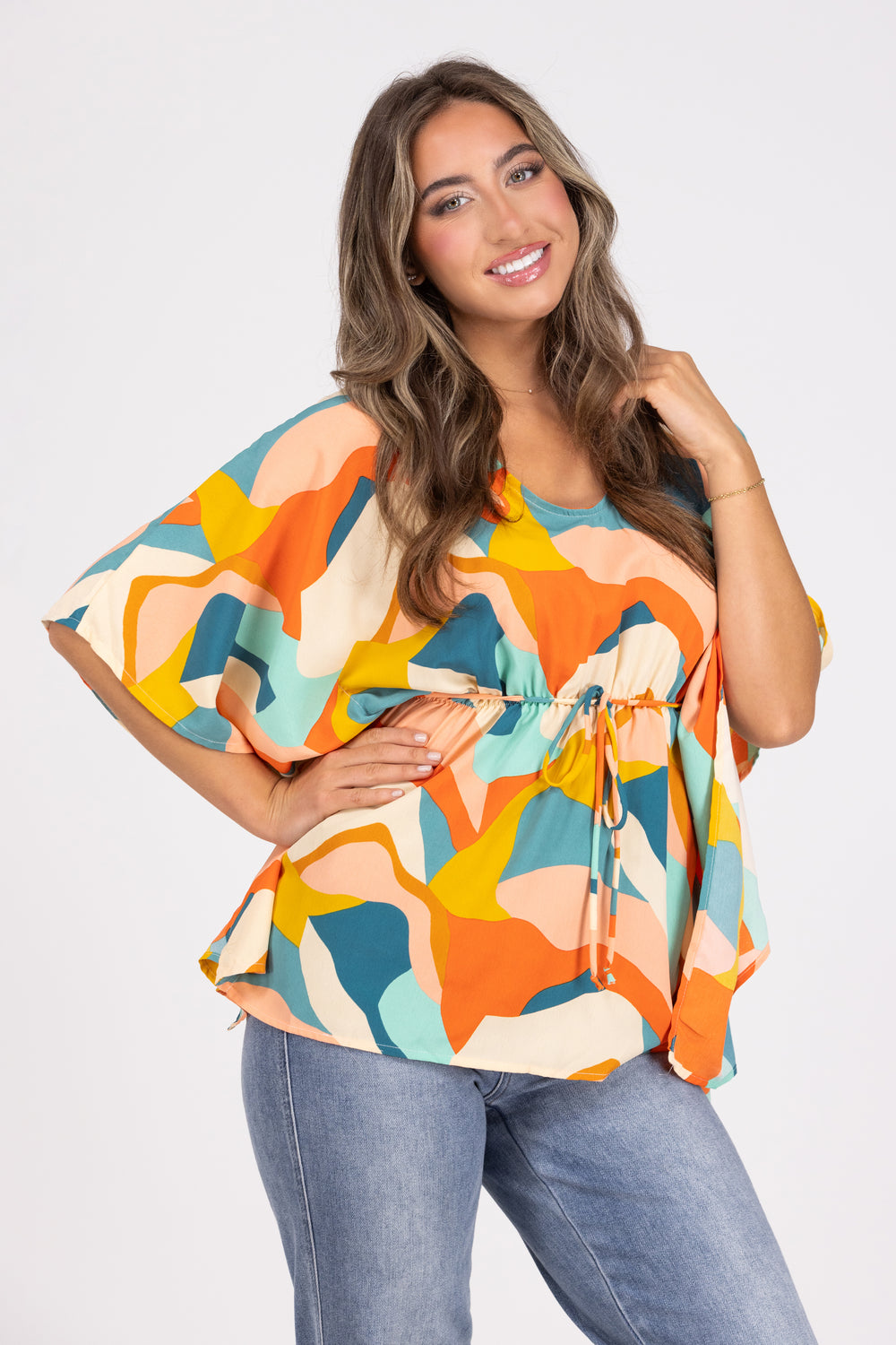 Feel your most authentic self in the Antique Florals Top by White Birch. This top features a scoop neck, an adjustable tie waist that has sewn in elastic, half sleeves, fun bright geo print and a lightweight poly Moroccan fabric. Pair with white denim or denim shorts and your favorite sandals.