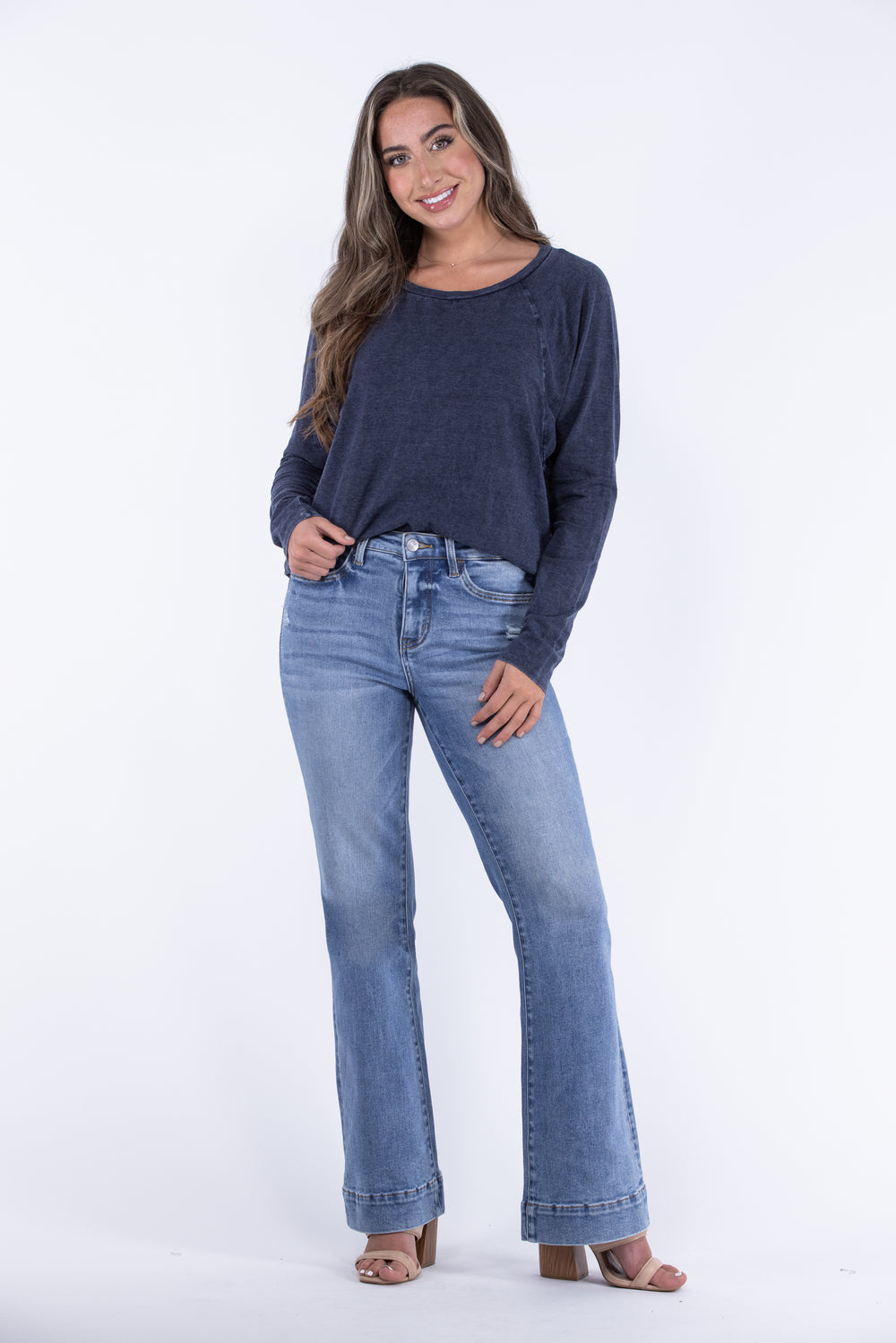 The At The End Of The Day Top by Rae Mode is the perfect top to wear not just at the end of the day but any day anytime! Need to run errands or hang out for the day then the At The End Of The Day Top is perfect for you! It features a round neckline, long sleeves, round hemline, and mineral washed fabric. Pair it with a bright color cami for a fun look!