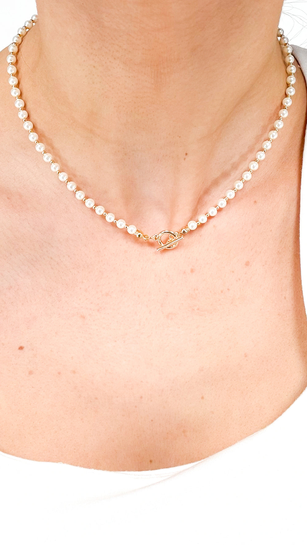 Introducing the B.b. Lila Pretty Pearl Toggle Necklace. This 17-inch chain necklace features a beautiful toggle clasp, making it easy to put on and take off. Perfect for any occasion, this necklace exudes sophistication and style.