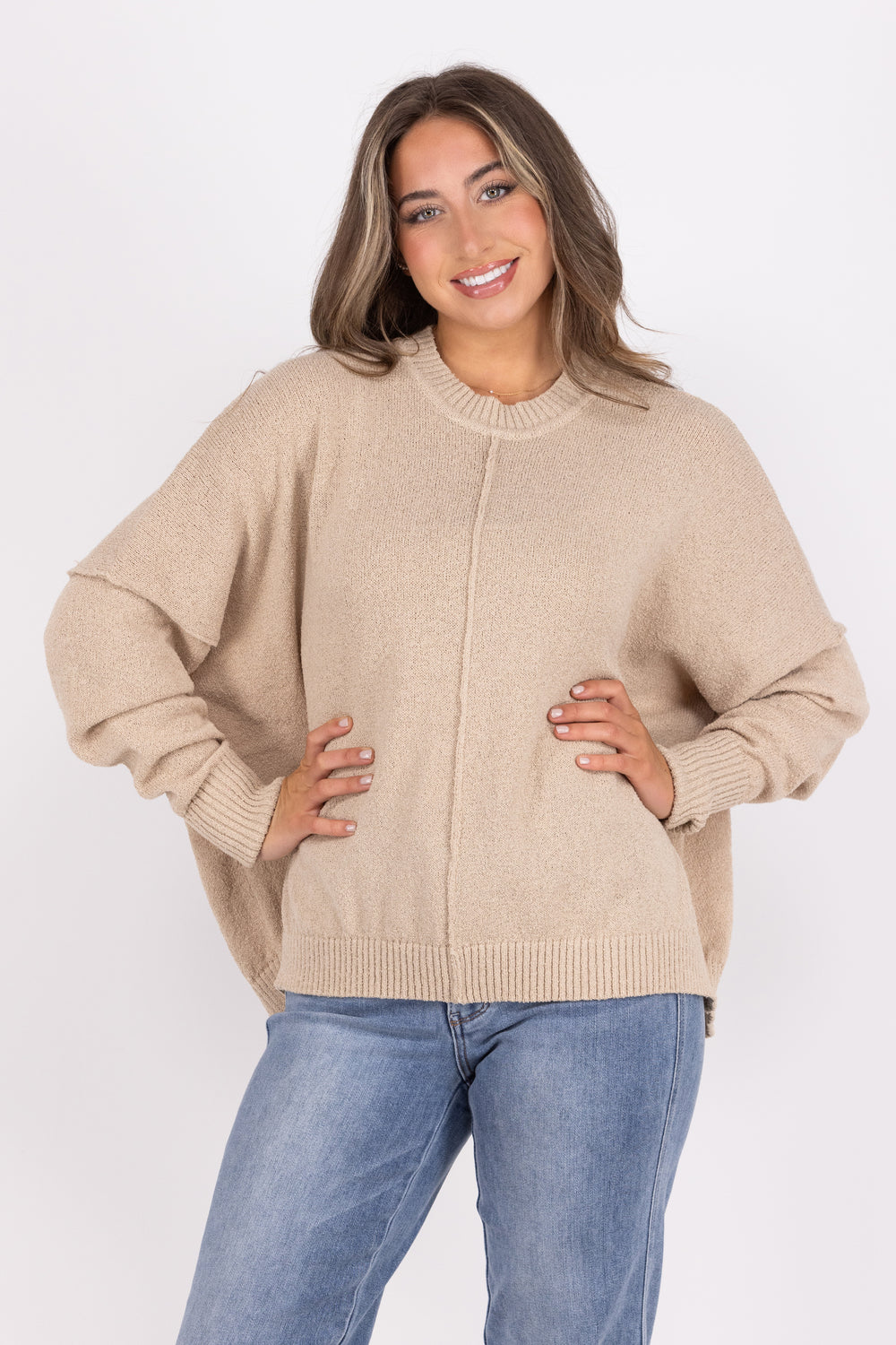 The Baking Pie Sweater from Andree by Unit is great when preparing to host friends. It features a rounded neckline, a ribbed design on the collar, cuffs and hemline, along with exposed stitching vertically on the front and around the shoulders. Pair with denim and booties for a stylish outfit to host friends.