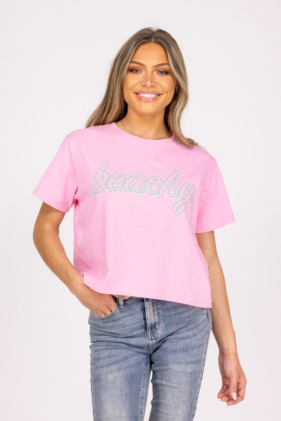Stroll through the sand in style with our Beachy Graphic Crop Top from Wishlist! This trendy cropped tee features a playful "beachy" graphic and pairs perfectly with any denim shorts for a fun day in the sun. Get ready for some serious beach vibes!
