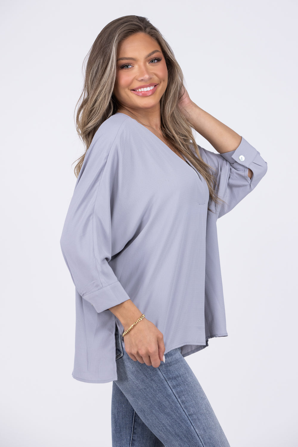 The Beautiful Day Top by Ee:some is a solid colored blouse with a V-neck top and flattering side slits . A buttoned cuff adds a nice touch to the 3/4 sleeves. Pair this top with your favorite denim to enjoy the next Beautiful Day.