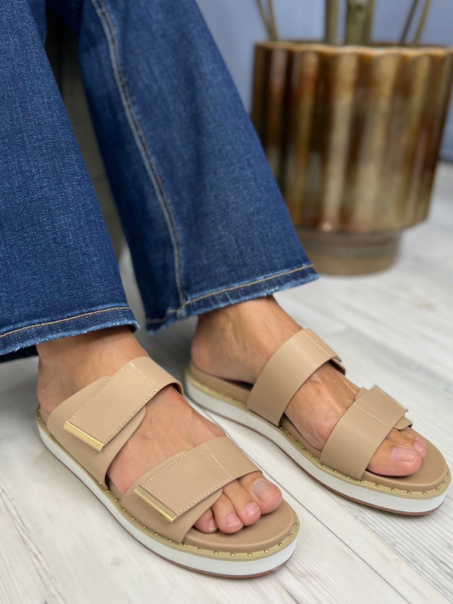 Step into summer with the Bethany Sandal from Shu Shop. Made with a faux leather upper and footbed, these sandals are both stylish and comfortable. The adjustable hook and loop closure ensures the perfect fit, while the cupped footbed provides support. Finished with gold stud detailing, these sandals are a must-have for your warm weather wardrobe.