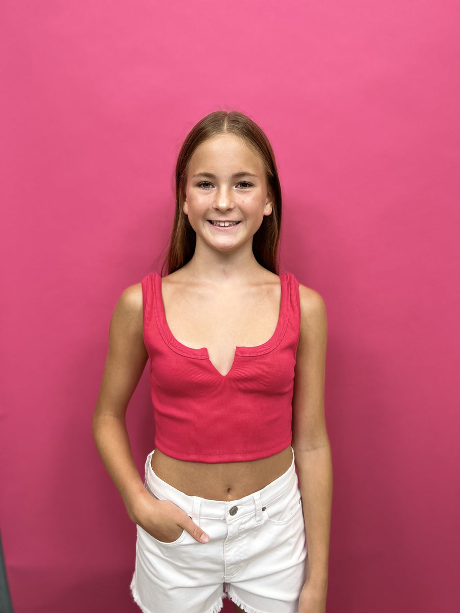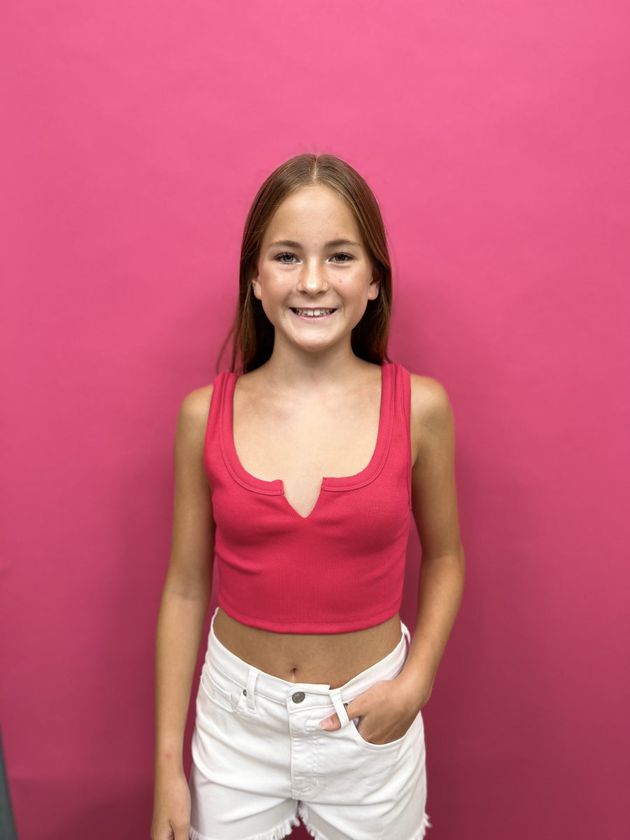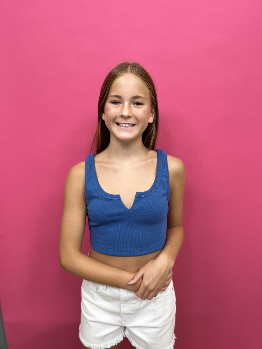 The Blissful Nights Tank Top by Signature8 is a ribbed, cropped tank top that features raw edge straps with u-shaped neck with small v-slit. Perfect for layering or wearing on its own.