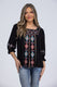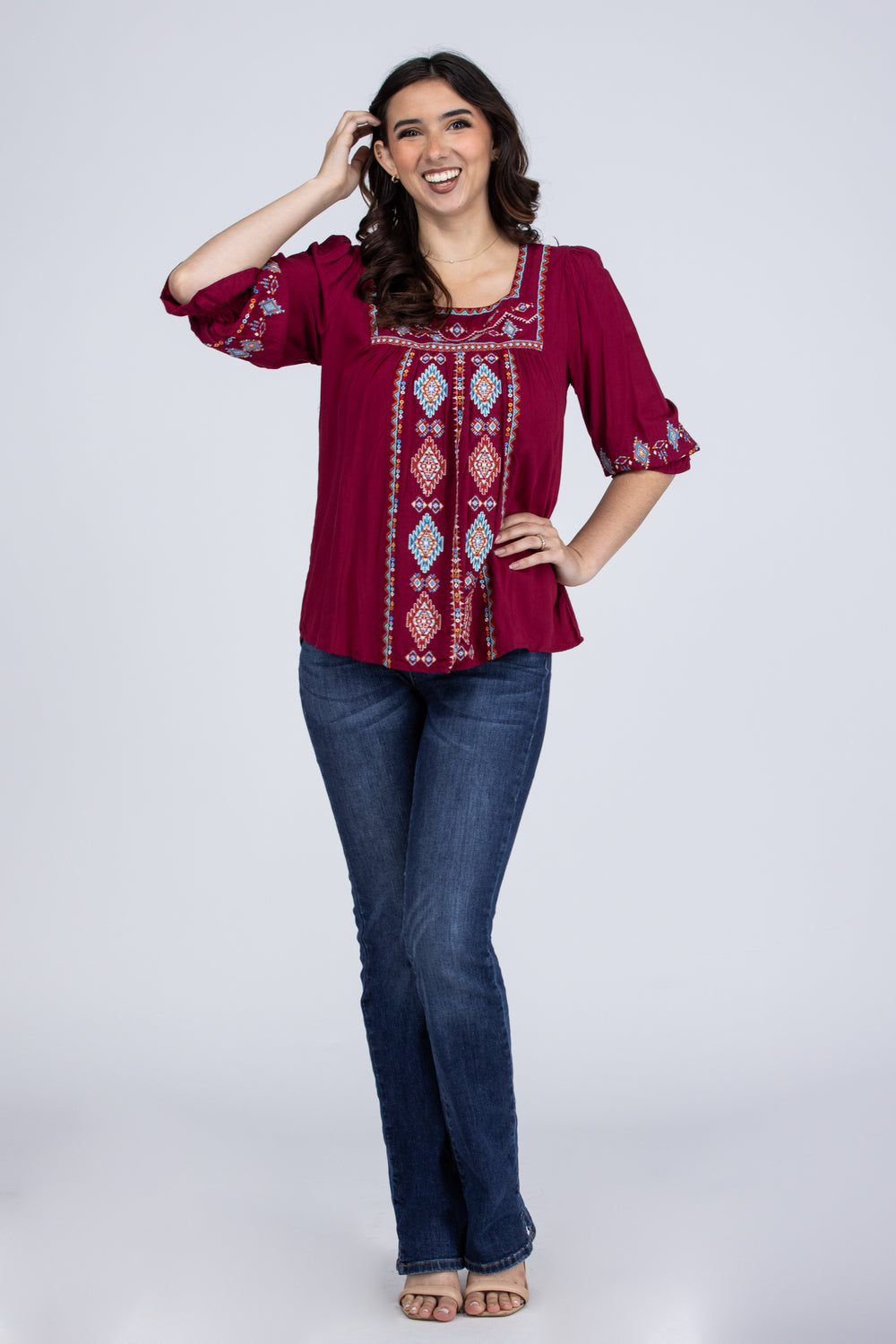Bree's Top by Andree features a square shaped neckline, half sleeves with a gathered cuff, beautiful embroidery from neckline to hemline, and embroidered accents on the sleeves. Non sheer, woven. Beautiful.