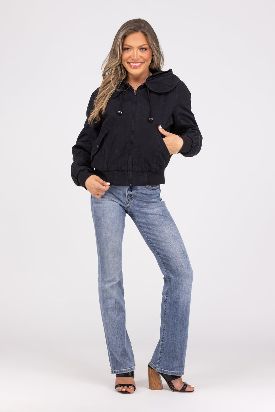 The Bring Happiness Jacket by White Birch is a long sleeve solid woven jacket with a zippered front featuring a ribbed knit inset, side pockets, and a hidden pocket to tuck away the hood. The Hood has adjustable drawstrings. The fabric is a medium weight and woven material. You'll always Bring Happiness when you wear this jacket!
