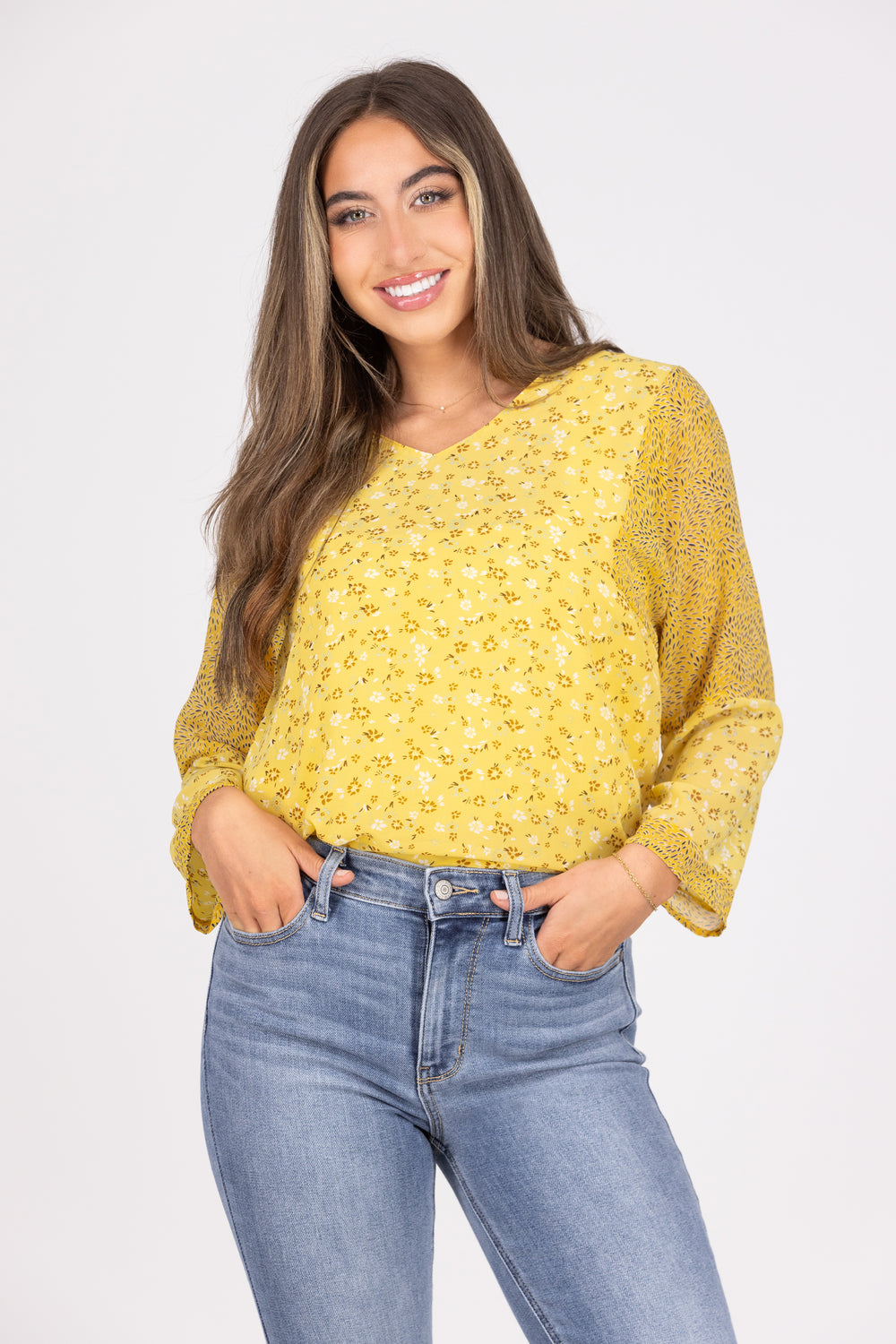 The By The Phone Top by Hayden is for those love a good contrasting print! This 3/4 sleeve top features a V-neckline, keyhole on back with button closure, straight sleeve edge, round hemline, and is fully lined for coverage! This top pairs well with white or dark denim and good accessories!