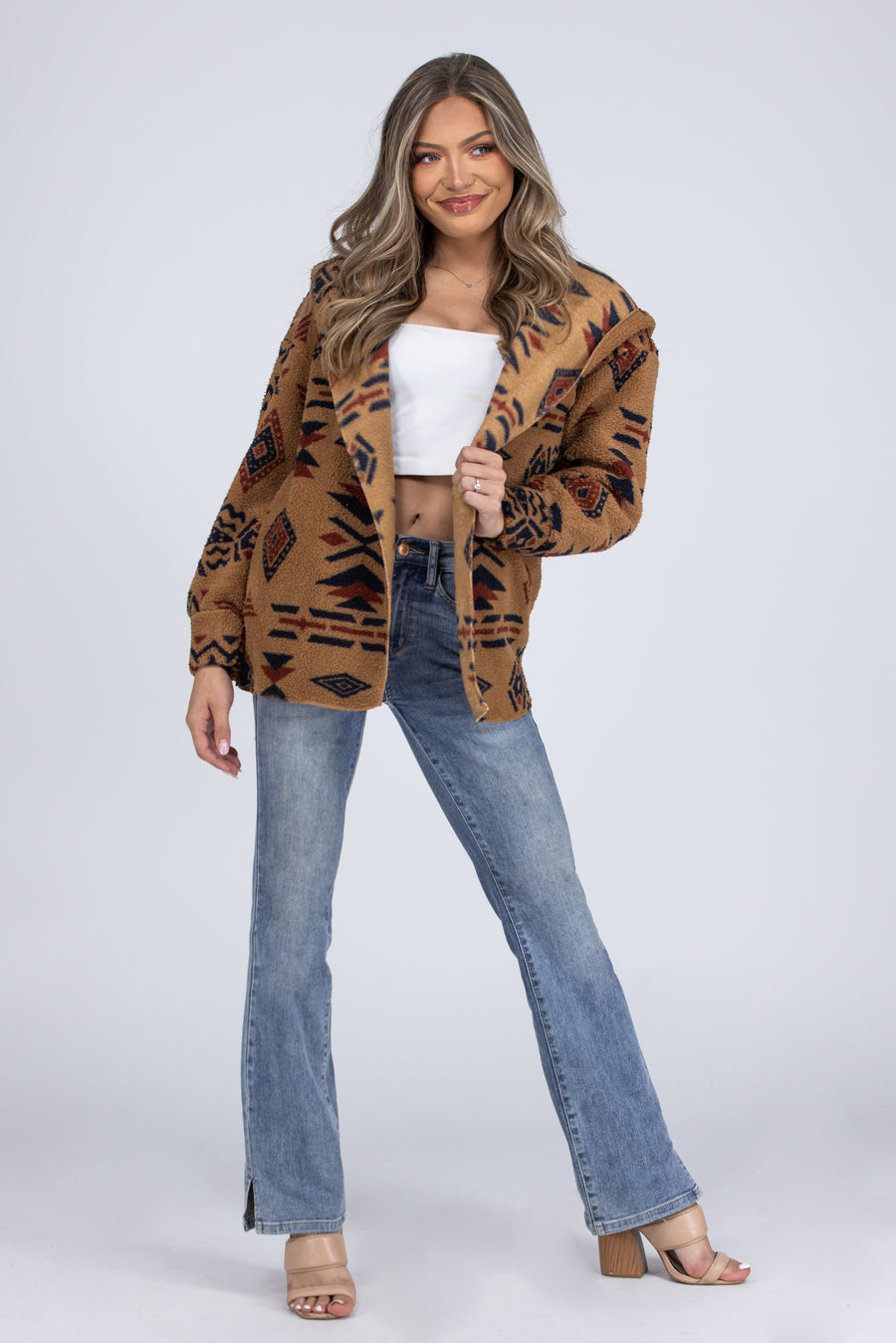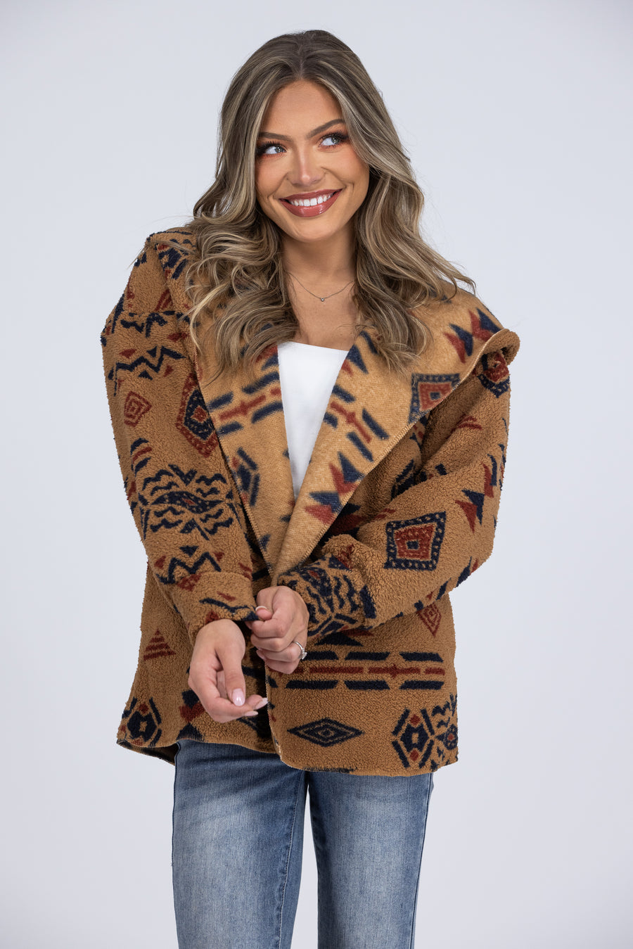 Stay cozy and stylish in our Cactus Fields Fleece Jacket by Very J. The tribal print adds a touch of boho style while the hood and pockets provide practicality. Perfect for chilly adventures or just lounging in style.