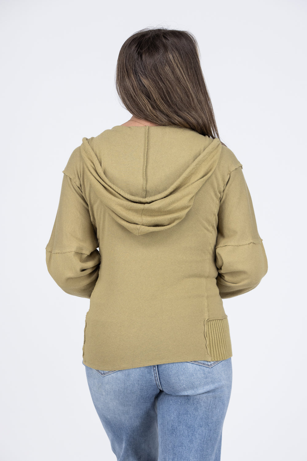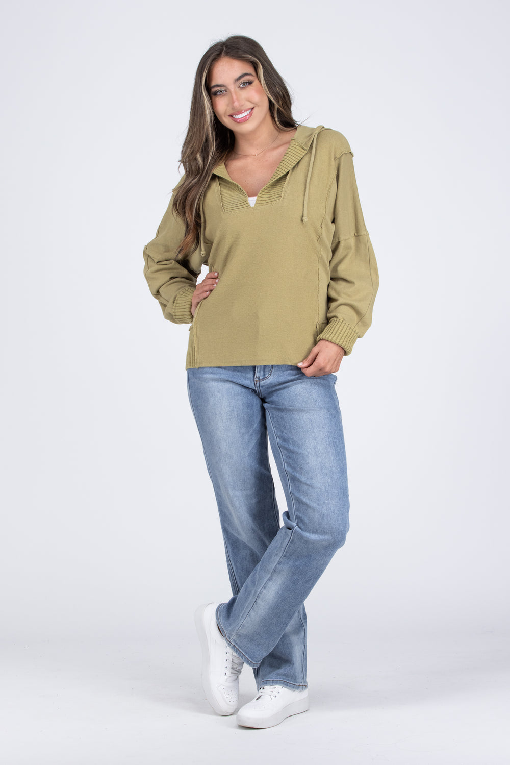 The Calling Me Over Top By Easel is a terry knit pullover hoodie. It features ribbed cuffs, V Neckline and bottom hemline. It offers a hood and drawstring, exposed seaming, loose fit and slouchy silhouette. Pair with denim or leggings for a stylish but comfortable outfit!