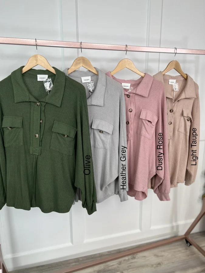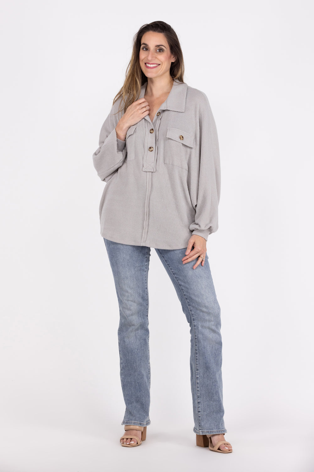 The Can't Let It Go Long Sleeve Top from Andree by Unit is perfect for a day in town with friends. It features a collared V-neckline with functional buttons. There are functional pockets with buttons and dolman sleeves. Pair with leggings and booties for a stylish look on the town.