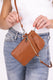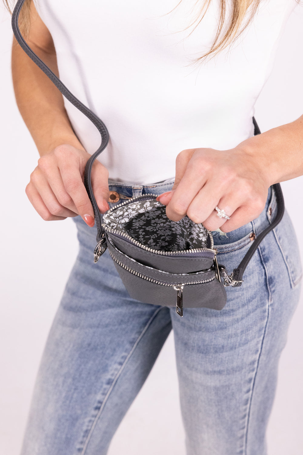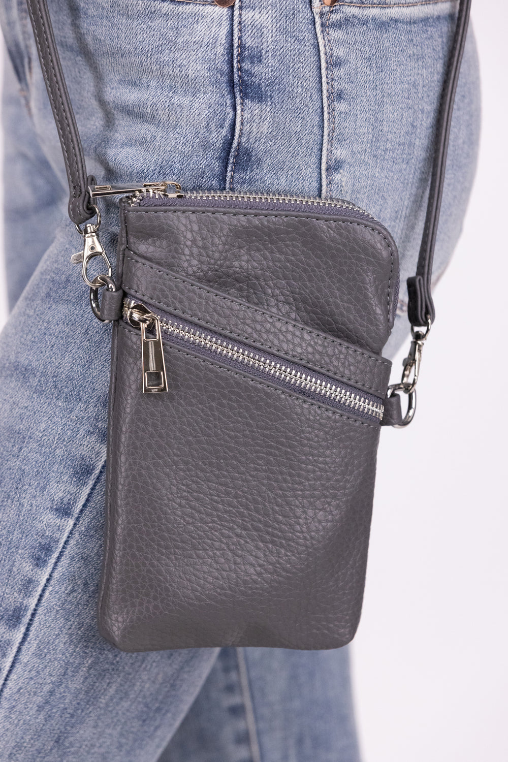 The Carrie Crossbody is perfect! Metal zippers accent a grain vegan leather. Front zipper pocket can store a small card sleeve. Behind that, is an open pocket, large enough for most phones inside a case. The top zipper wraps around the side, giving you a wide opening to access your belongings easily.