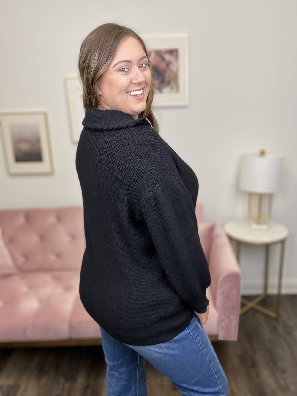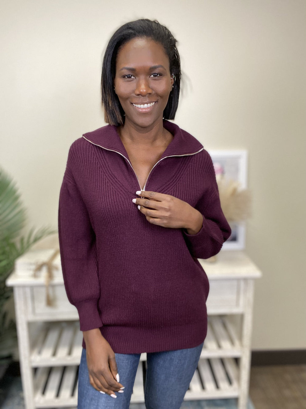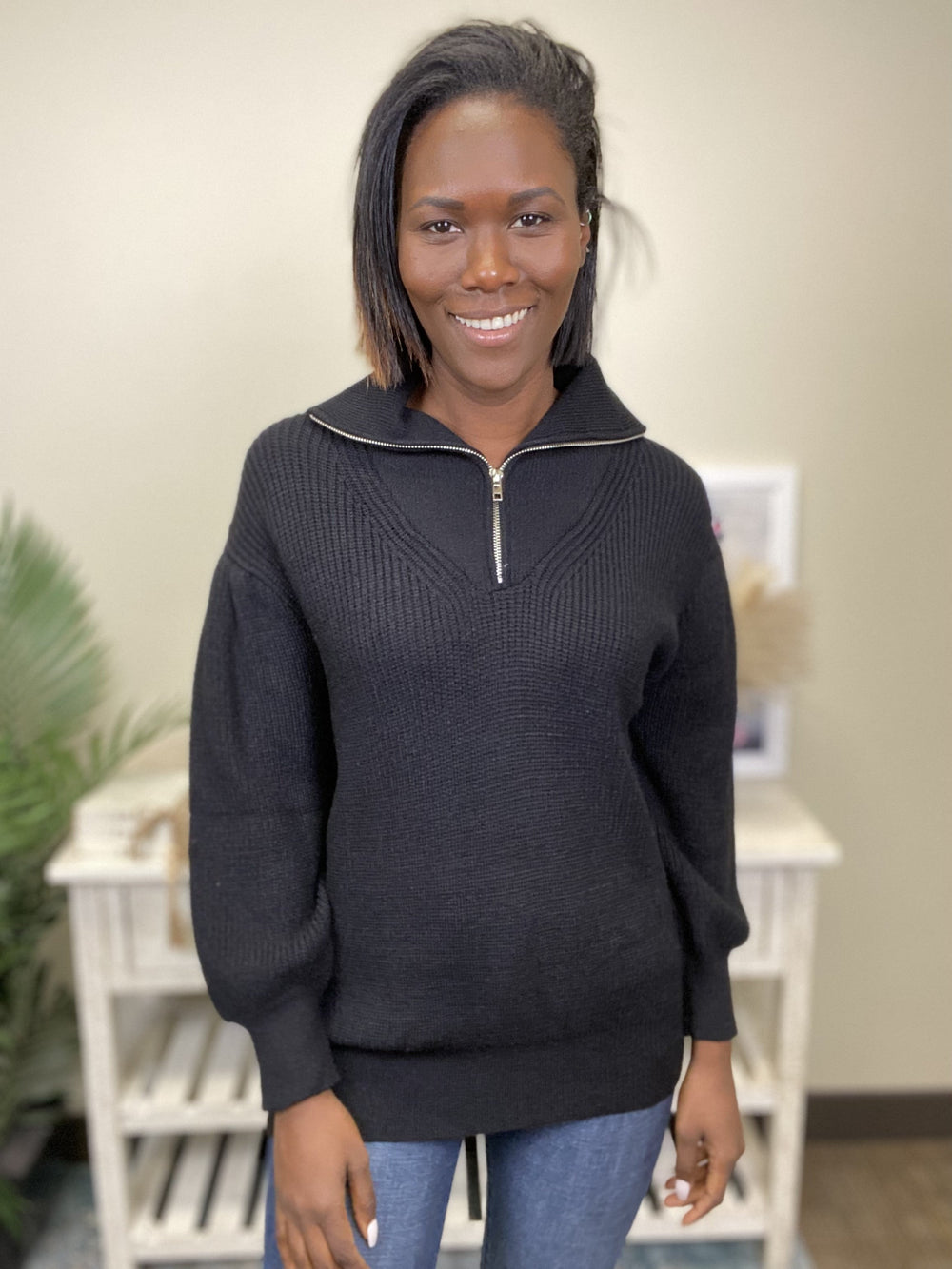 Transition from one season to the next in style with The Change Of Weather Sweater by White Birch. It is a solid knit sweater featuring long balloon sleeves and a ribbed hemline that is further accented with a 1/4 zippered front. The fabric is a medium weight sweater knit. The relaxed fit bodice makes sure you look stylish and effortless.