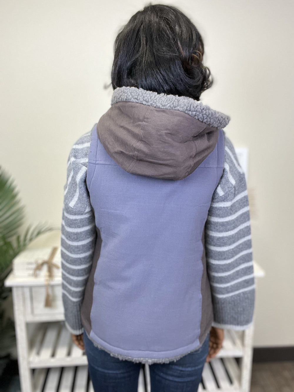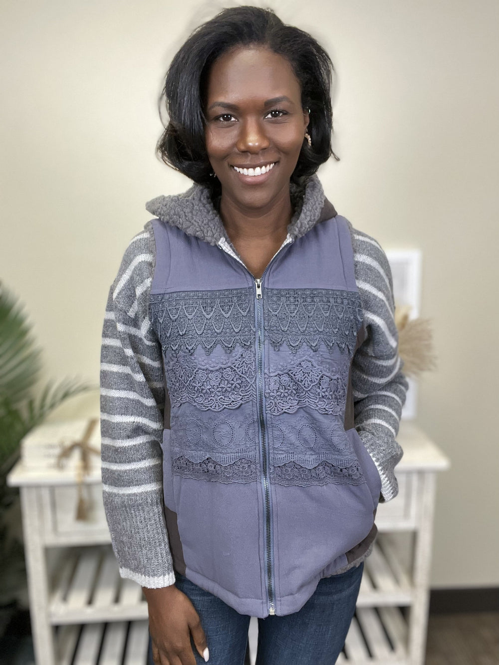 The Comfort Joy Vest By Oddi is the perfect vest to wear when out enjoying your day to day activities! This Vest is sure to keep you warm and looking good! This Vest features faux Sherpa lining, hood, zip up, two side pockets, lace trimming, contrasting fabric material, and semi rounded hemline. The Comfort Joy Vest can be paired on to any of your favorite outfits!