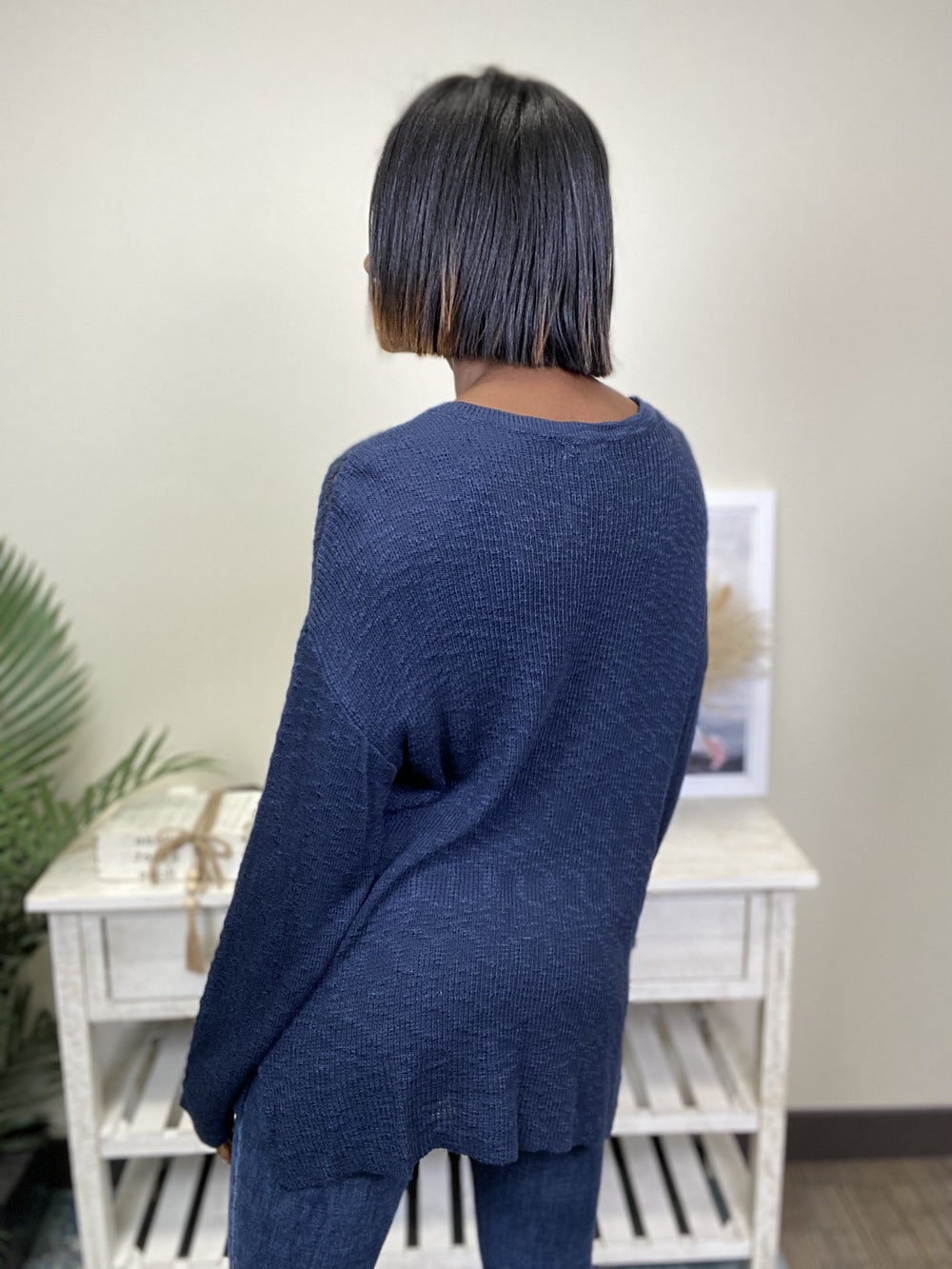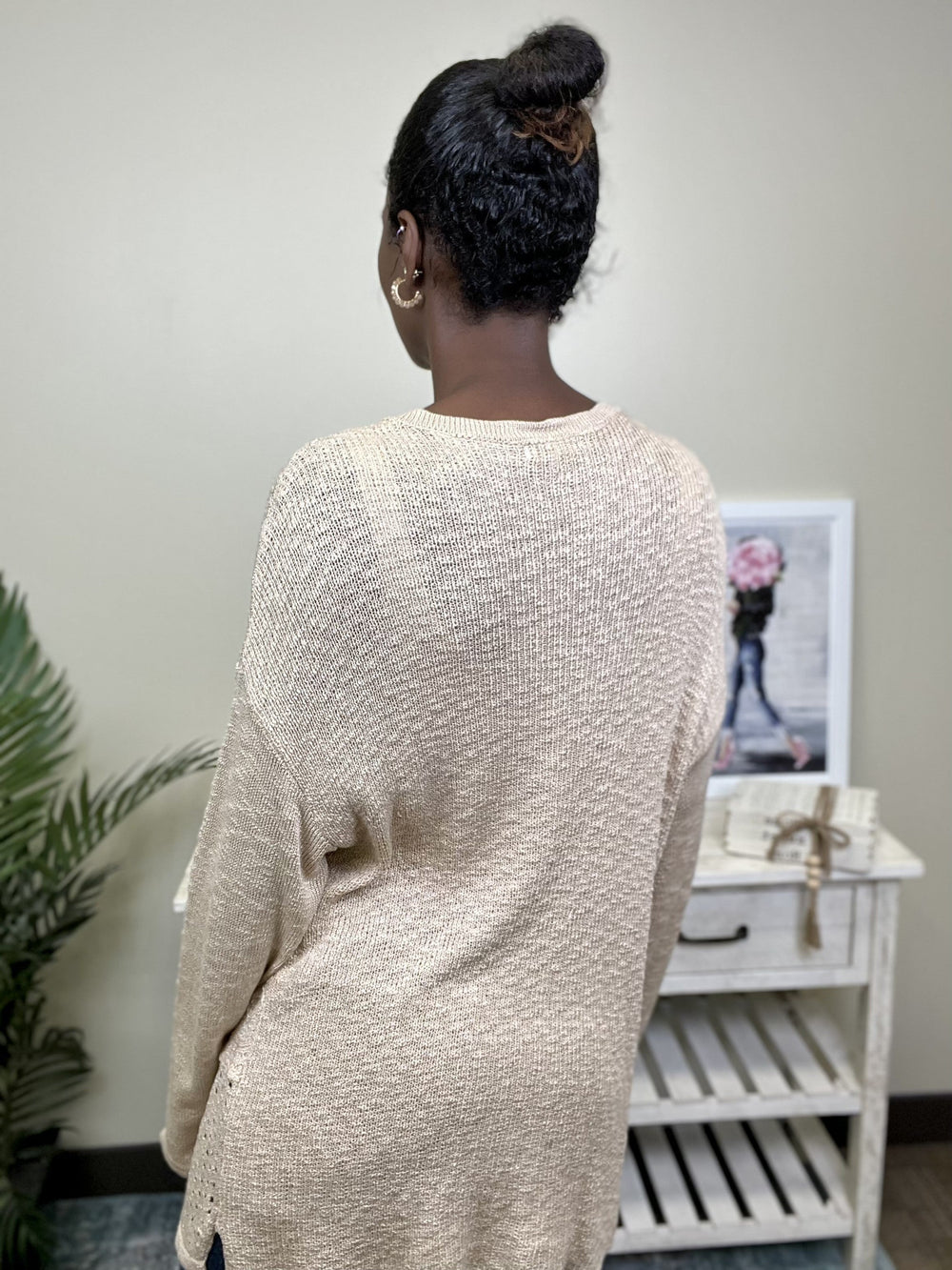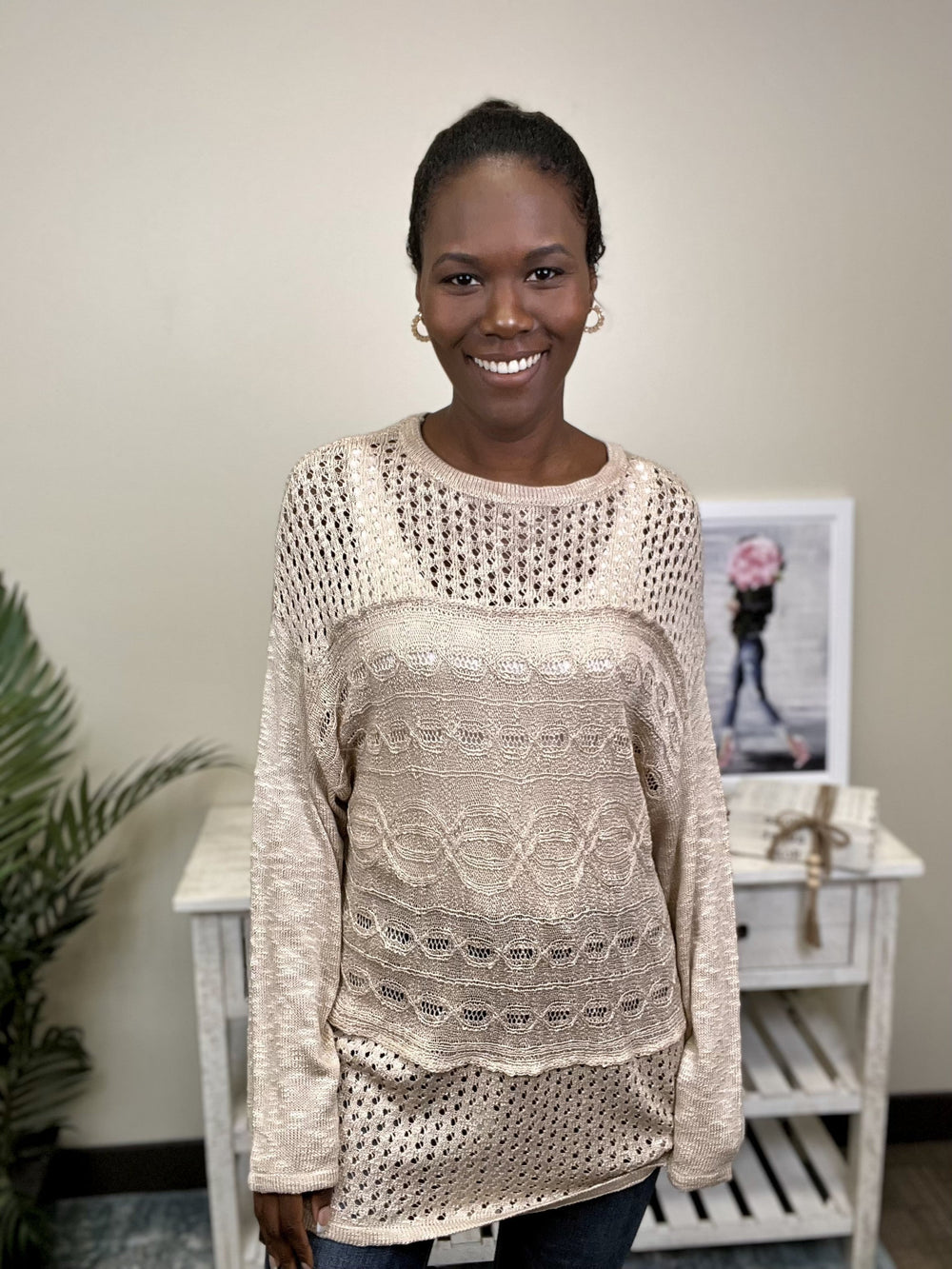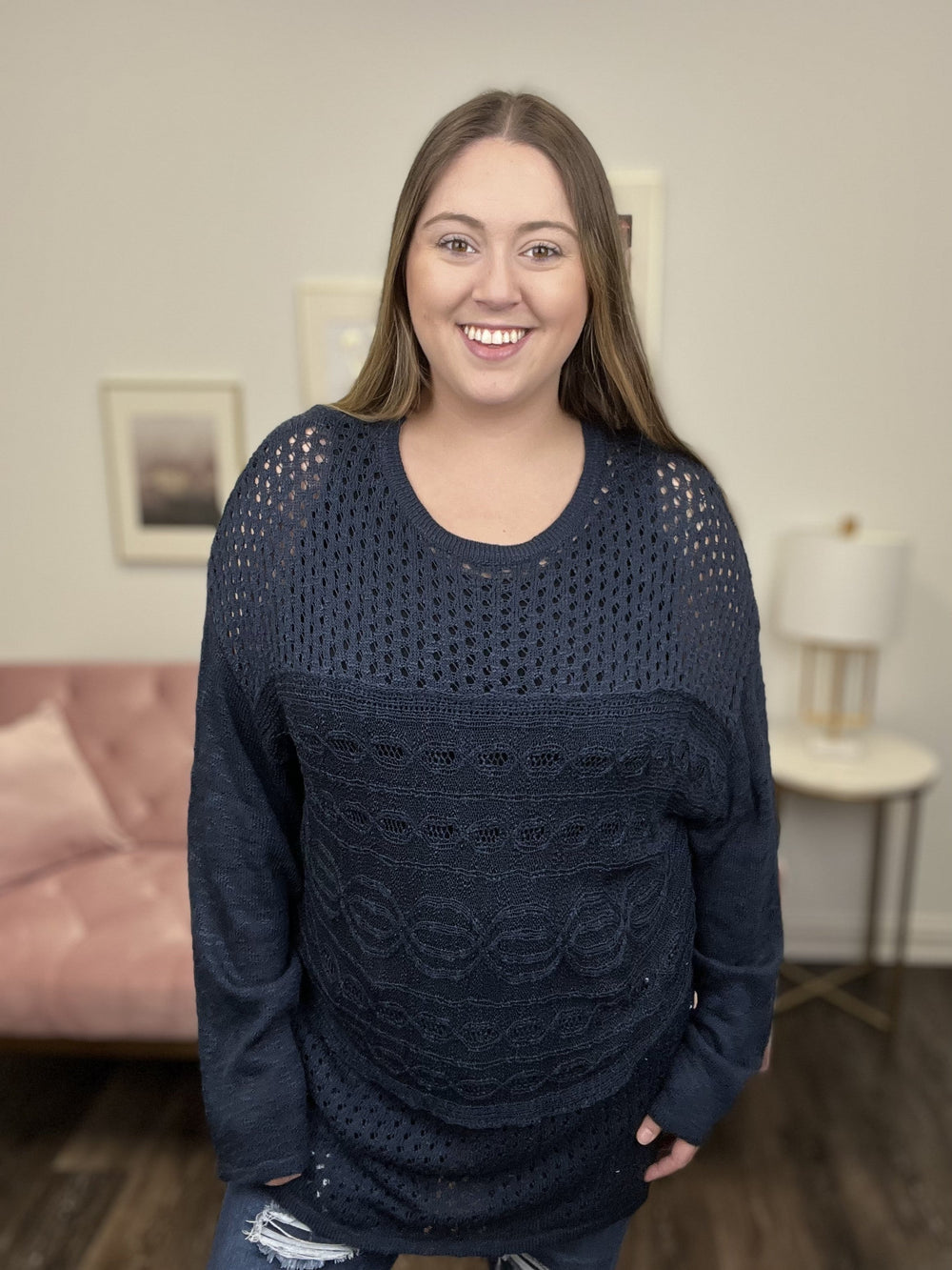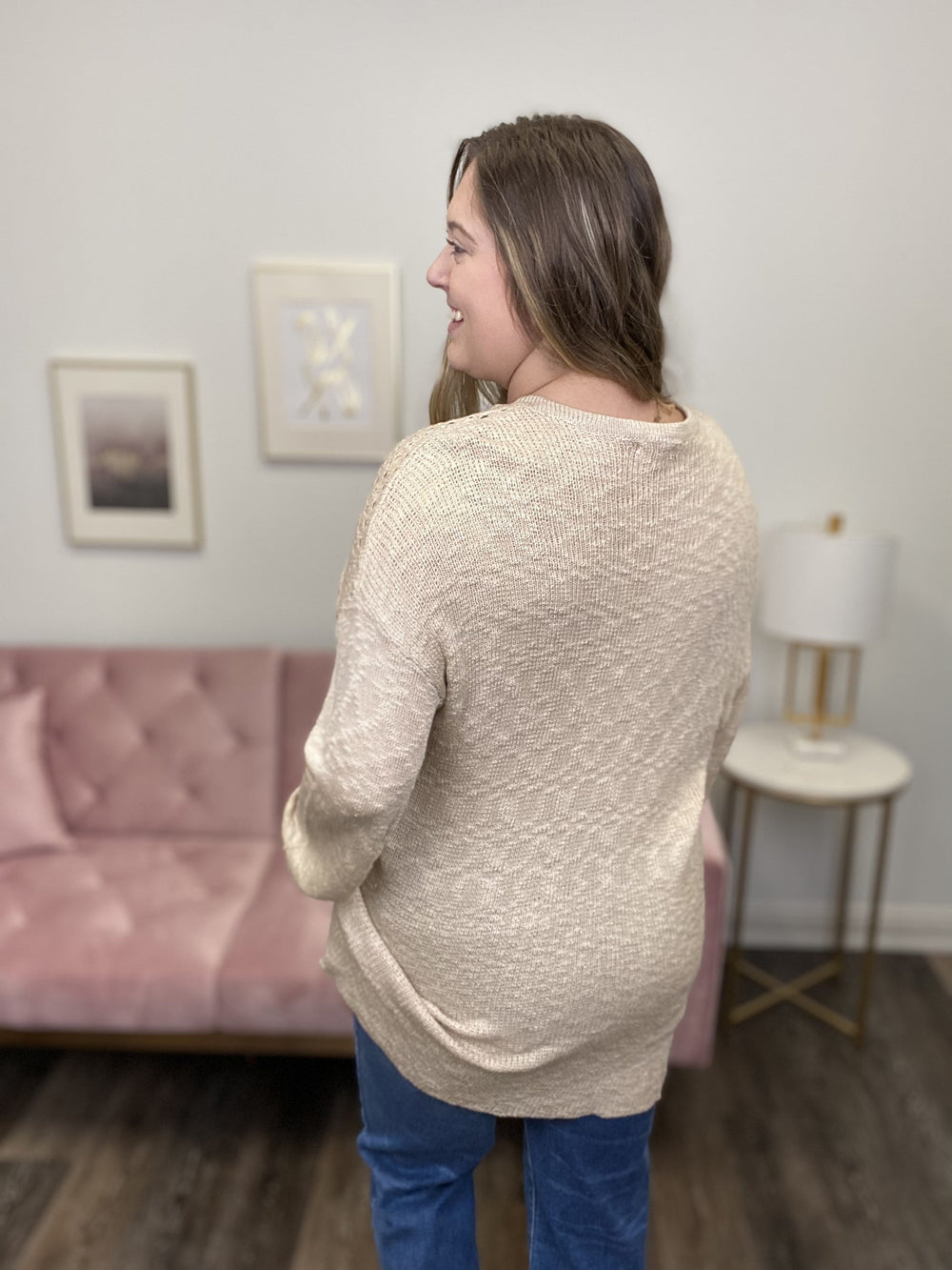 The Comfortably Cute Sweater by Easel is perfect for enjoying the Fall weather! This sweater features a crew neckline, knitted detailing and a hi-lo hemline with slits on the sides. The Comfortably Cute Sweater can be paired with your favorite denim.