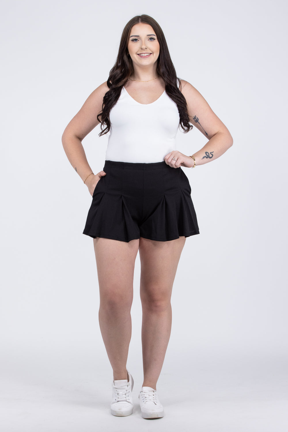 Give yourself some extra confidence in these pleated flare shorts by Heyson. These Confidence shorts give you the look of a skirt while giving you the peace of mind of a pair of shorts. This lovely pair of ruffled shorts also comes with pockets!