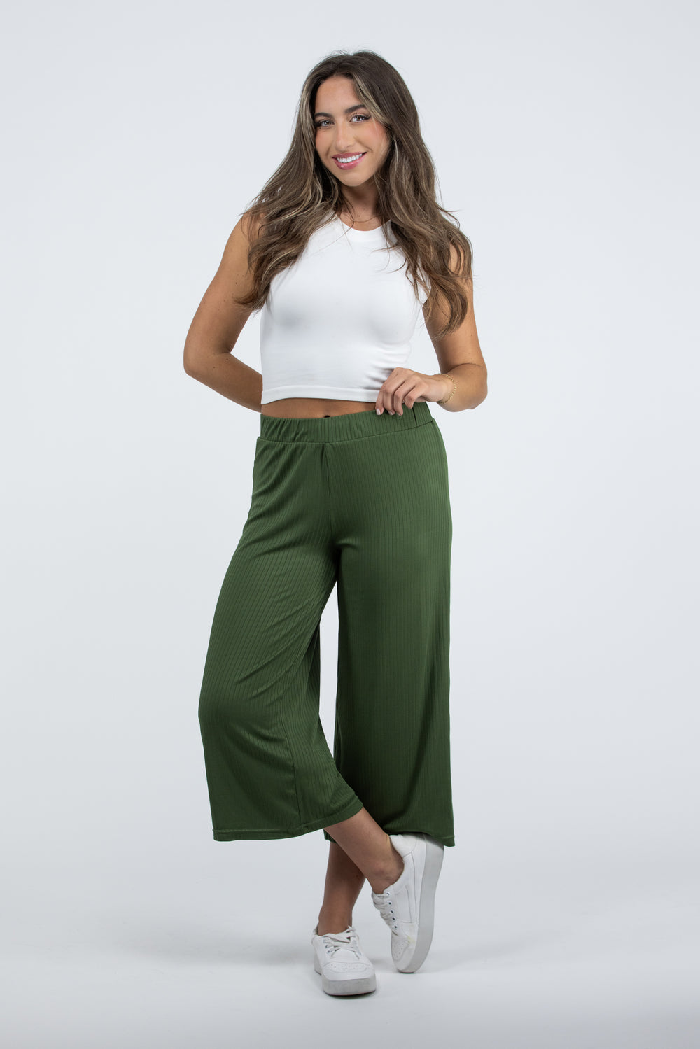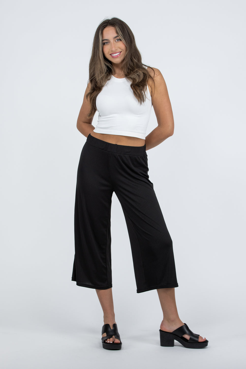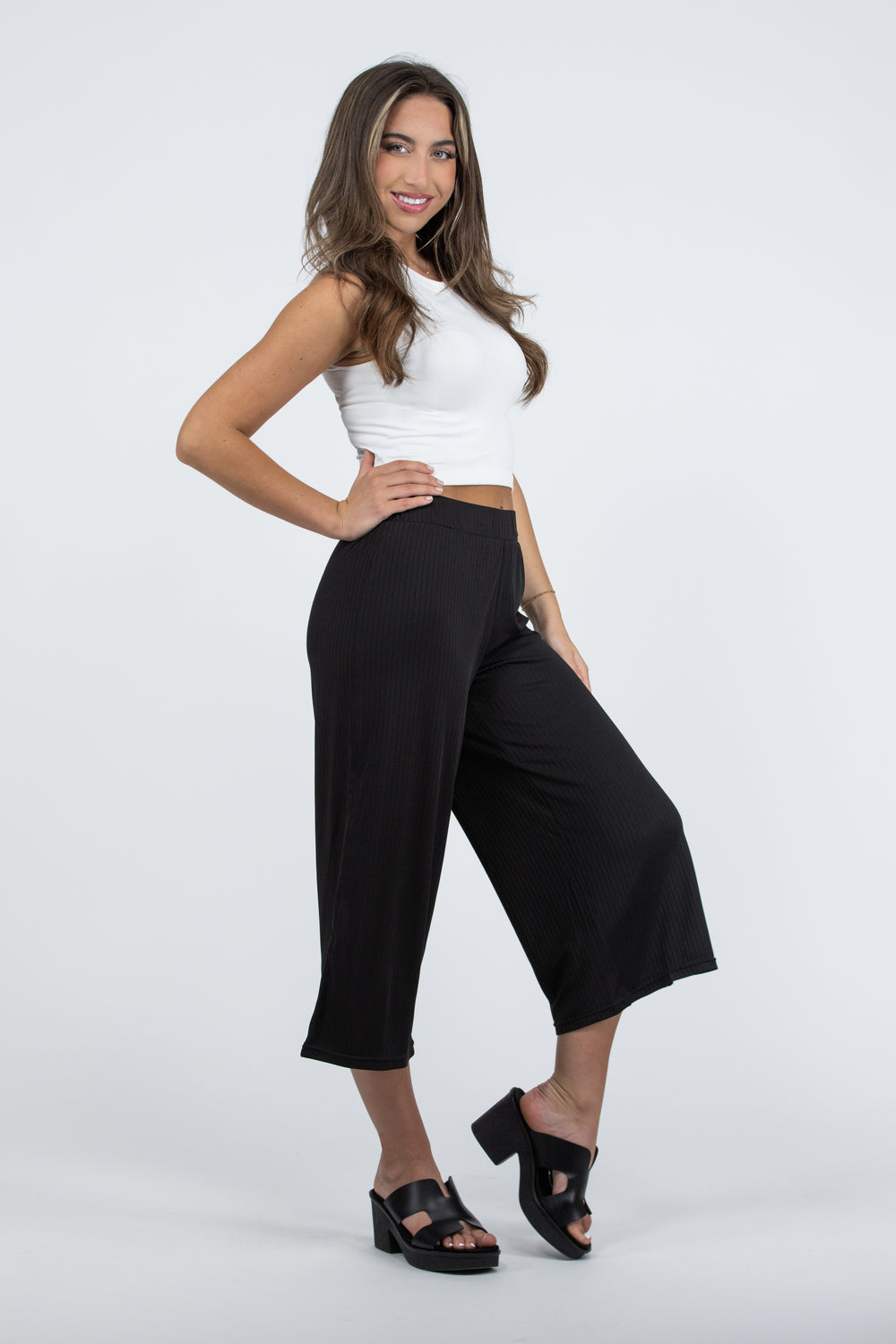 The Cooler Than You Culottes are ribbed knit flat front culottes with an elastic waistband. Pair these with your favorite tops for an easy going look that you can dress up or down depending on your mood that day.