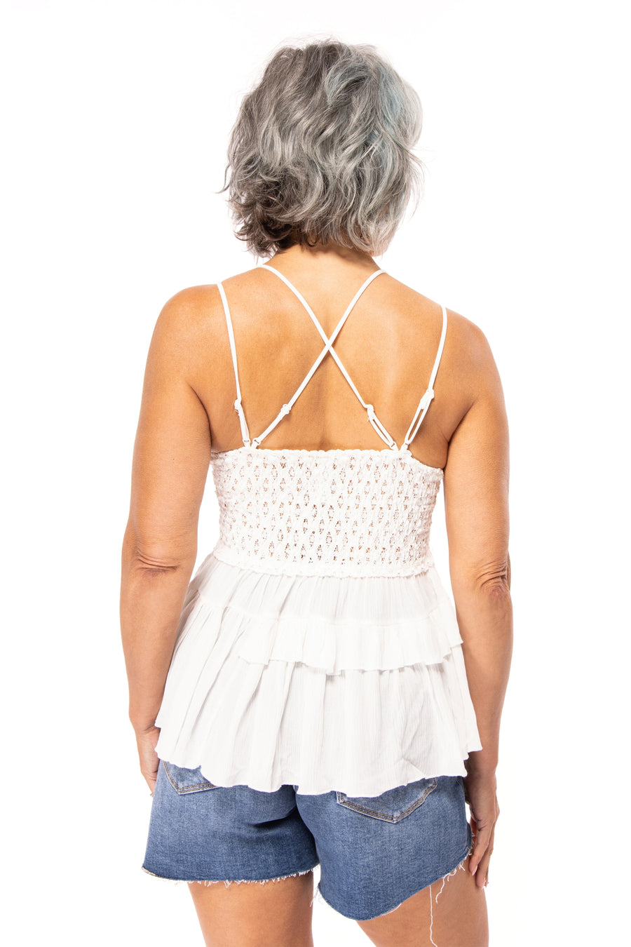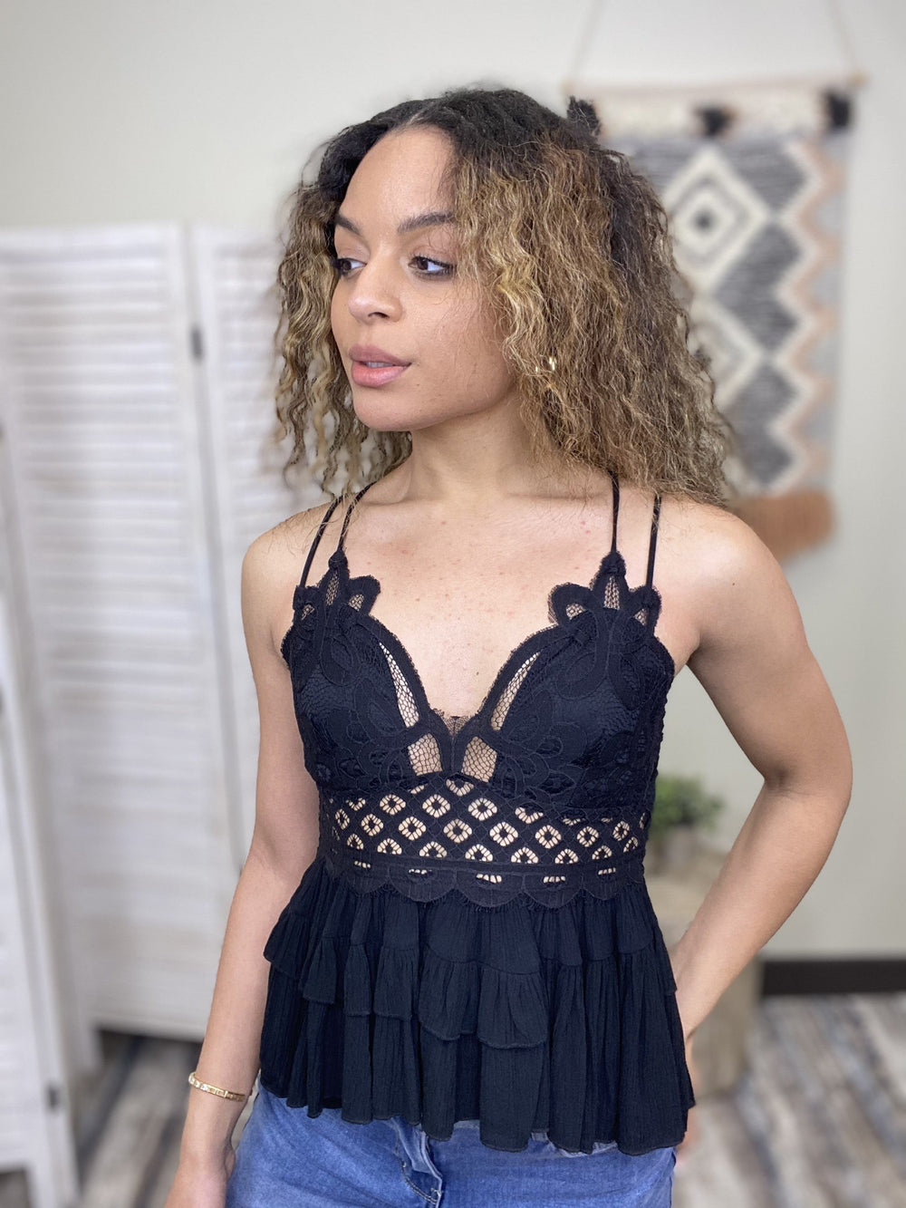 Crochet Lace Camisole by Zenana features a tiered ruffled peplum hem, removable bra pads and adjustable crisscross straps.