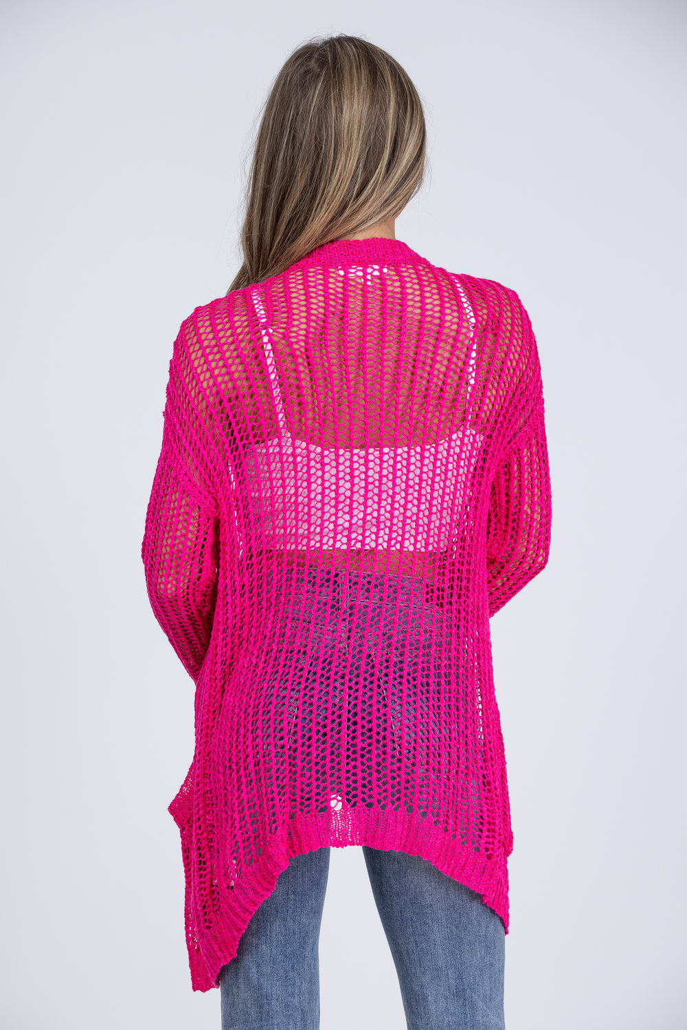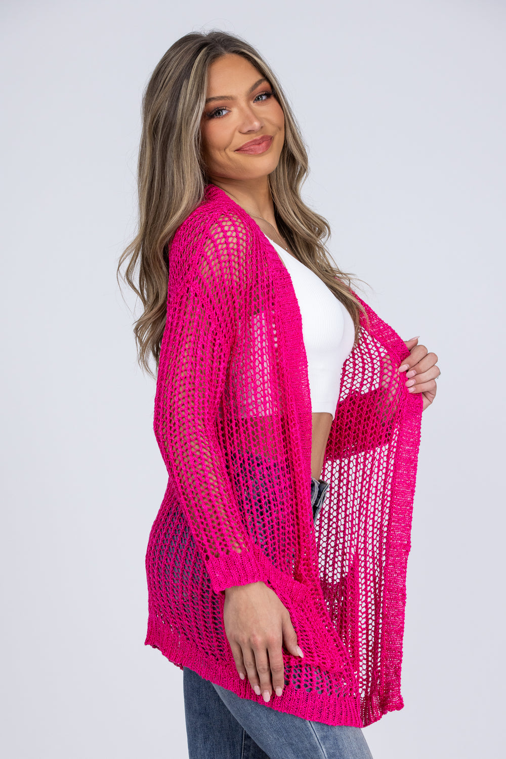 Dare to take a risk in The Crochet Me Crazy Cardigan by Miracle. Elevate your style with this adorable cardigan. It features lightweight crochet fabric, long sleeves with dropped shoulders, open front, patch pockets and ribbed straight hemline. Pair with cute white denim capris and a fitted tank for the perfect spring outfit or can easily be transformed into a swim cover-up setting you apart on your next beach day.